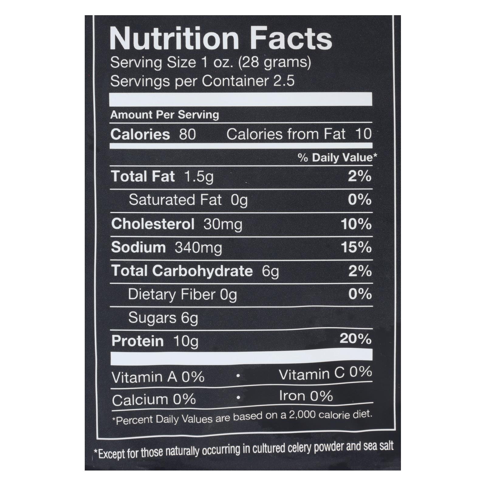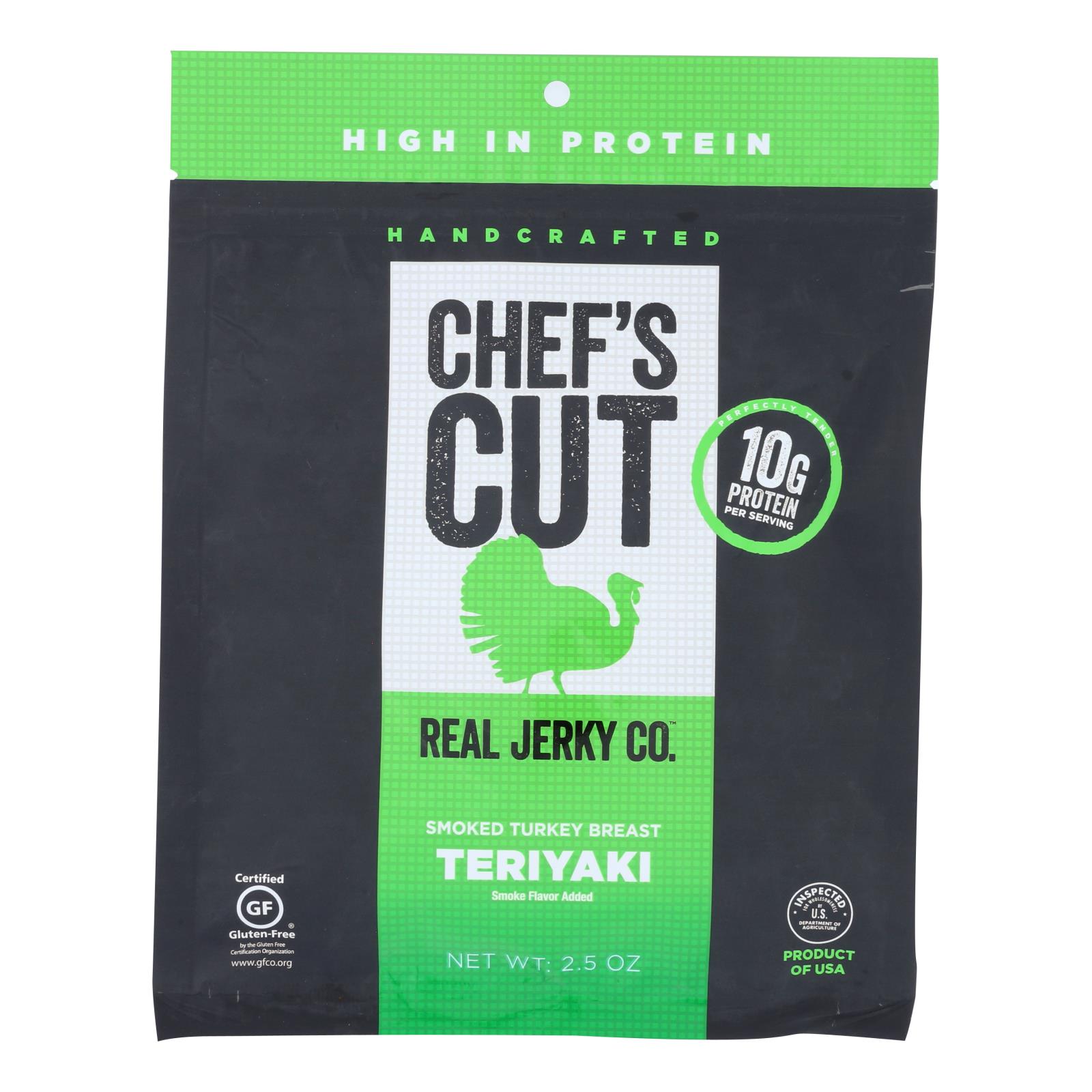 High in protein. 12 g protein per serving. Made with turkey breast. Smoke flavor added. Smoked turkey breast. Certified gluten-free by the gluten free certification organization. Www.gfco.org. No nitrites (except for those naturally occurring in celery powder and sea salt). Inspected for wholesomeness by us department of agriculture. Handcrafted. Perfectly tender. Real ingredients. Chef-crafted marinade. Slow smoked. Cut by hand. Jerky is an incredible invention. It can go anywhere, endure the elements, feed our hunger and sometimes attract bears. But jerky hasn’t been living up to its potential. It’s been lost in mystery meats and spices so hot you sweat for a week. Chef’s cut real jerky is redefining your favorite protein snack, hand-cutting premium meats and smoking them to tender perfection. With flavors this bold, you’d expect nothing less from founder and culinary mastermind chef blair swiler, who hates mysteries, but loves tell-all. Chef’s cut real jerky is the jerky you’ve always wanted. It’s jerky done right. Dig in. Keepin’ it real: we didn’t believe it was possible to make jerky from a bird and make it taste as delicious as jerky from a cow. How wrong that was! – shanrah & brock, los angeles, ca. Www.chefscutrealjerky.com. Facebook/chefcutrealjerky. Instagram. Twitter. (at)chefscutjerky. Product of usa.