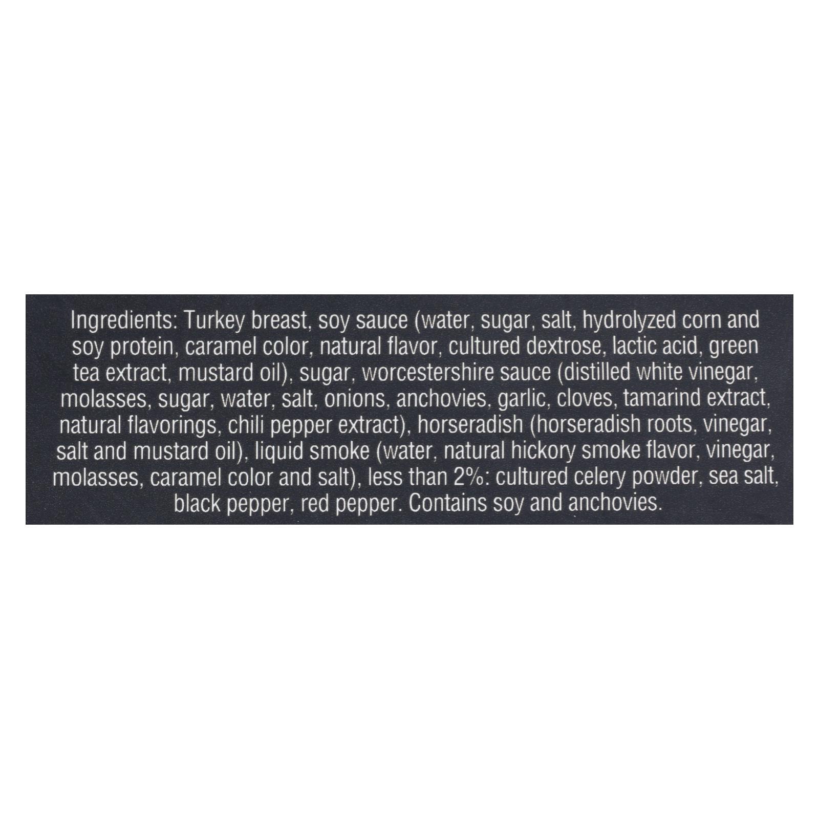 ingredients : turkey breast;soy sauce (water, sugar, salt, hydrolyzed corn and soy protein, caramel color, natural flavor, cultured dextrose, lactic acid, green tea extract, mustard oil);sugar;worcestershire sauce (distilled white vinegar, molasses, sugar, water, salt, onions, anchovies, garlic, cloves, tamarind extract, natural flavorings, chili pepper extract);horseradish (horseradish roots, vinegar, salt and mustard oil);liquid smoke (water, natural hickory smoke flavor, vinegar, molasses, caramel color an