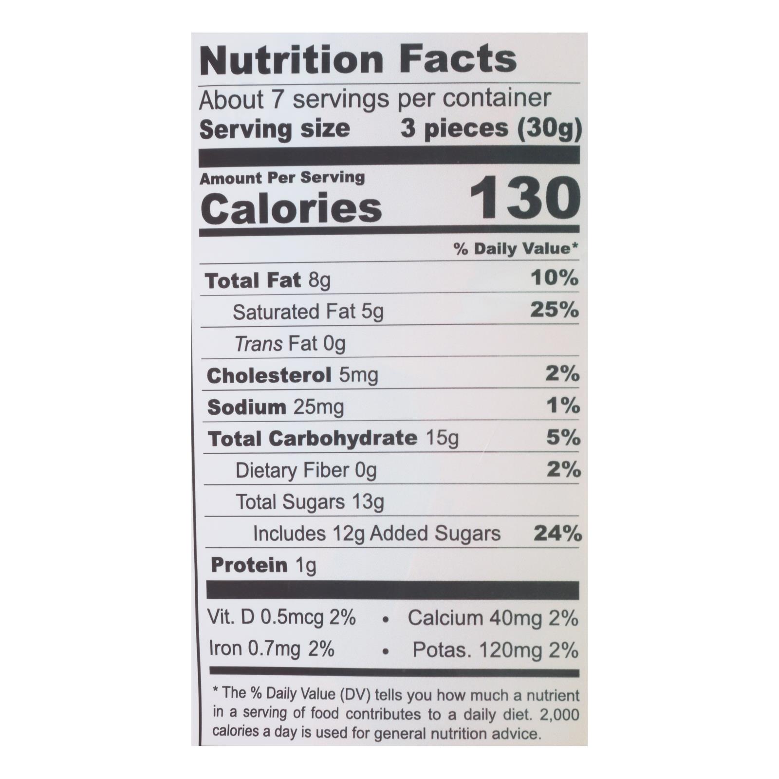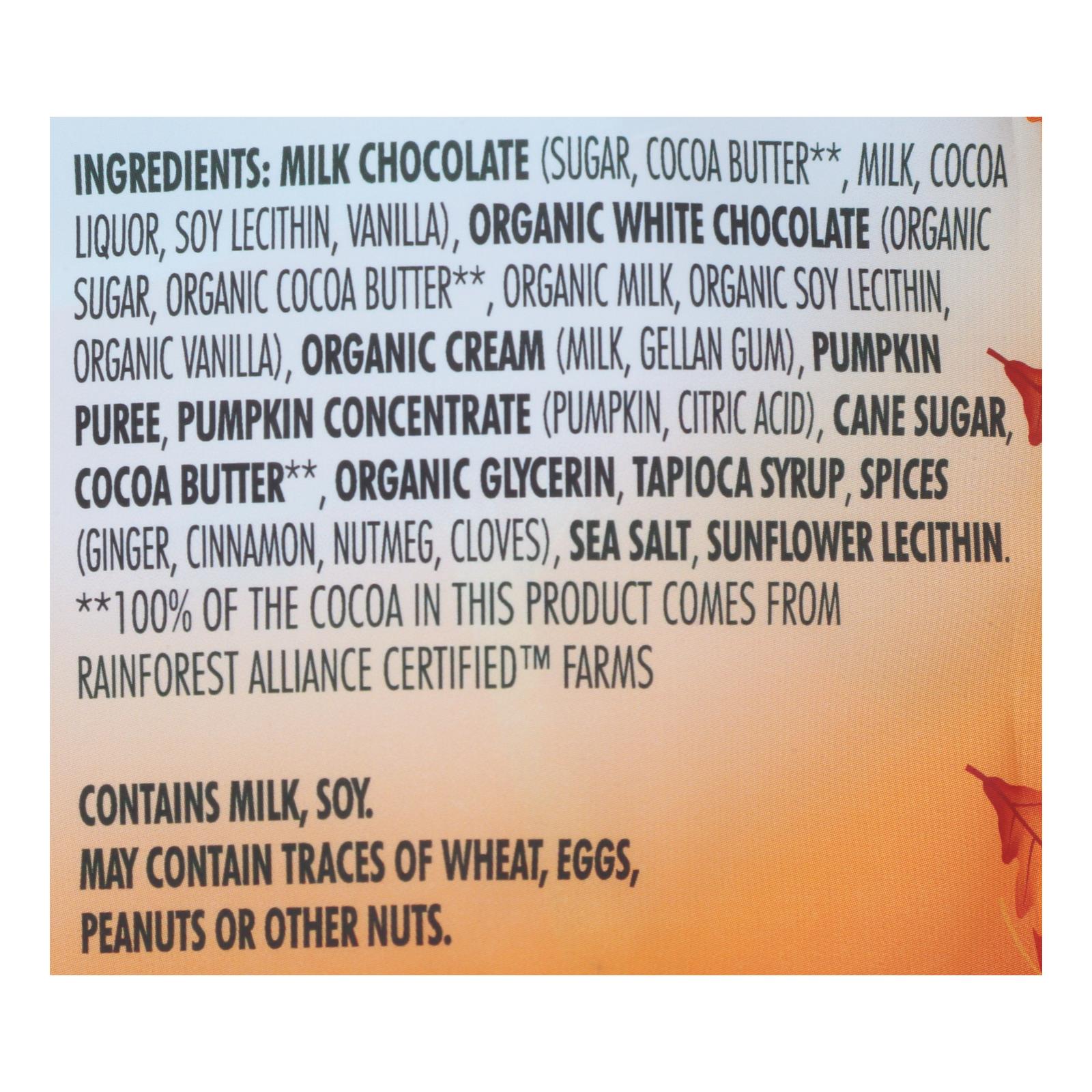 ingredients : milk chocolate (sugar, cocoa butter**, milk, cocoa liquor, soy lecithin, vanilla);organic white chocolate (organic sugar, organic cocoa butter**, organic milk, organic soy lecithin, organic vanilla);organic cream (milk, gellan gum);pumpkin puree;pumpkin concentrate (pumpkin, citric acid);cane sugar;cocoa butter;organic glycerin;tapioca syrup;spices (ginger, cinnamon, nutmeg, cloves);sea salt;sunflower lecithin