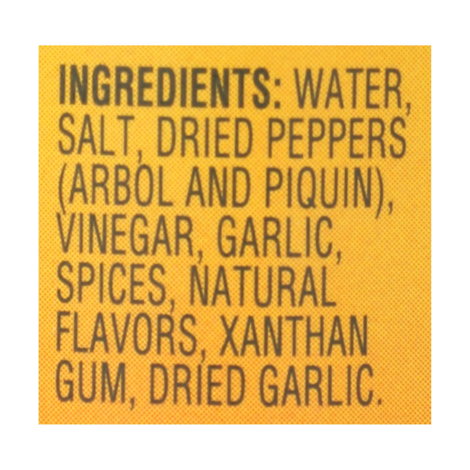 Water, salt, dried peppers (arbol and piquin), vinegar, garlic, spices, natural flavors, xanthan gum, dried garlic.