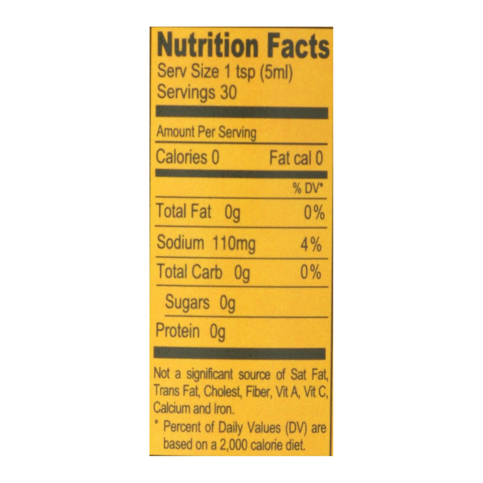 - Serving size: See nutrition facts panel; approximately 30 servings per 5 fl. oz. bottle