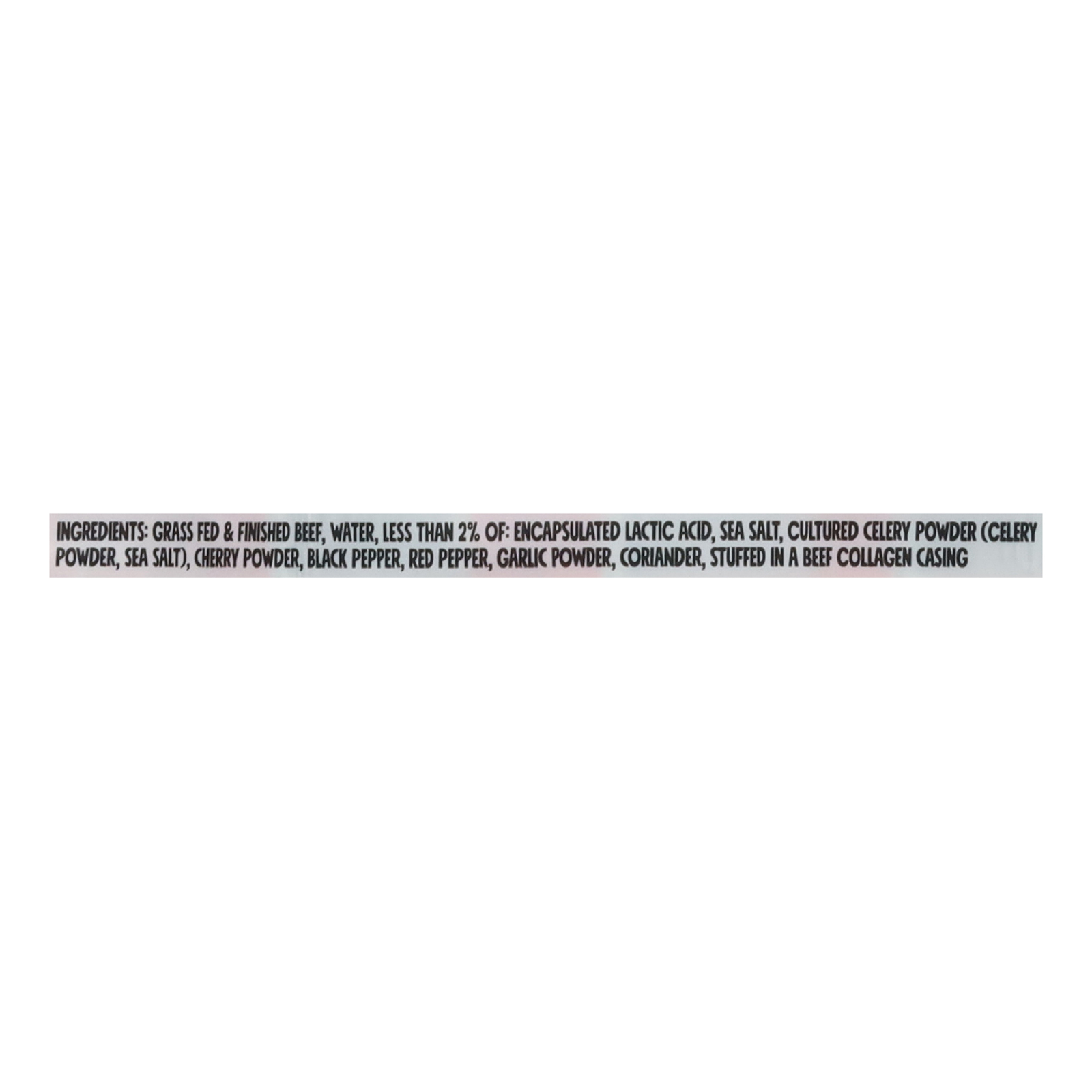 Grass-fed & finished beef, cultured celery powder, sea salt. No antibiotics, no added hormones, no preservatives. No dairy, gluten, or GMOs.