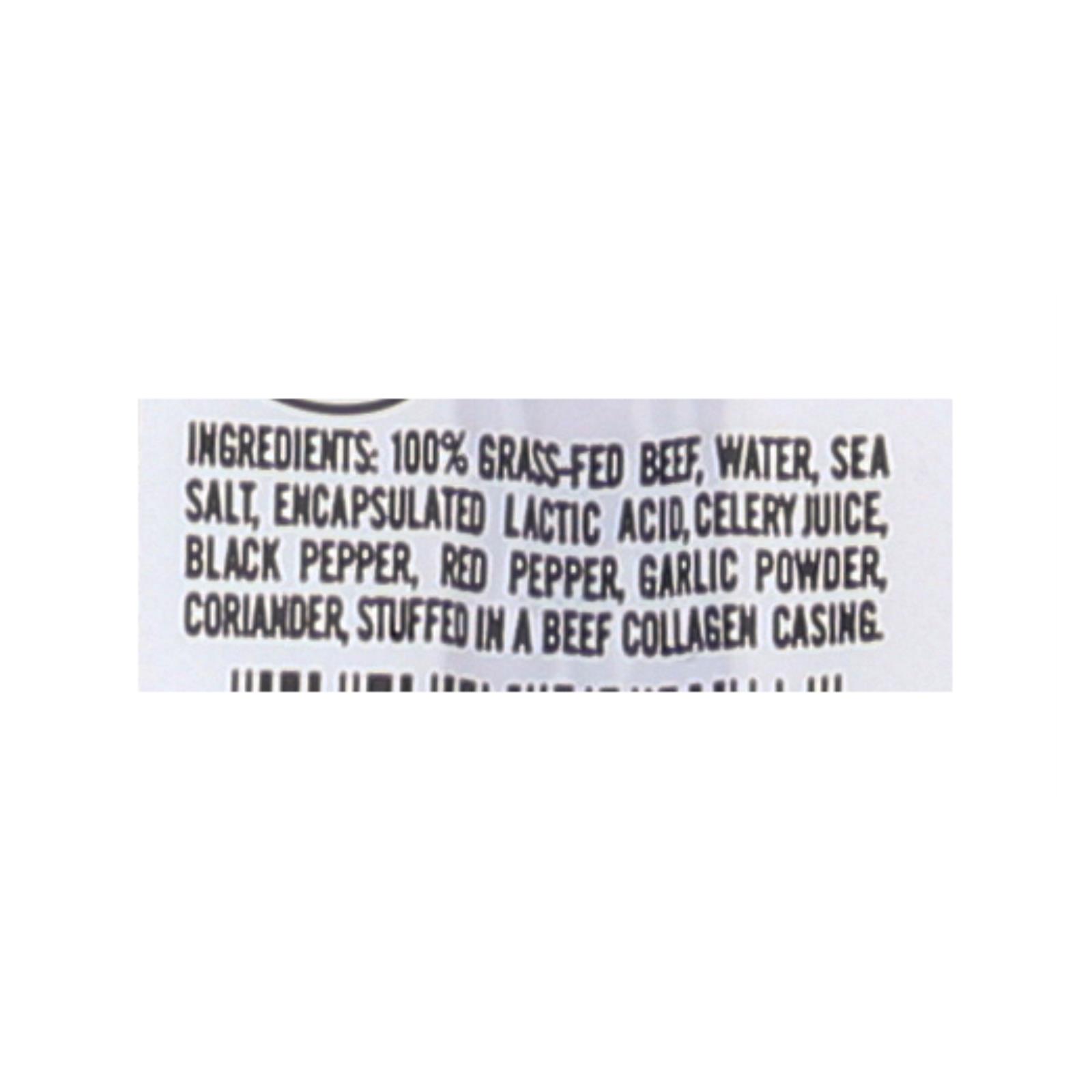 Grass fed & finished beef, water, sea salt, encapsulated lactic acid, cultured celery powder (celery powder, sea salt), black pepper, red pepper, garlic powder, coriander, stuffed in a beef collagen casing.