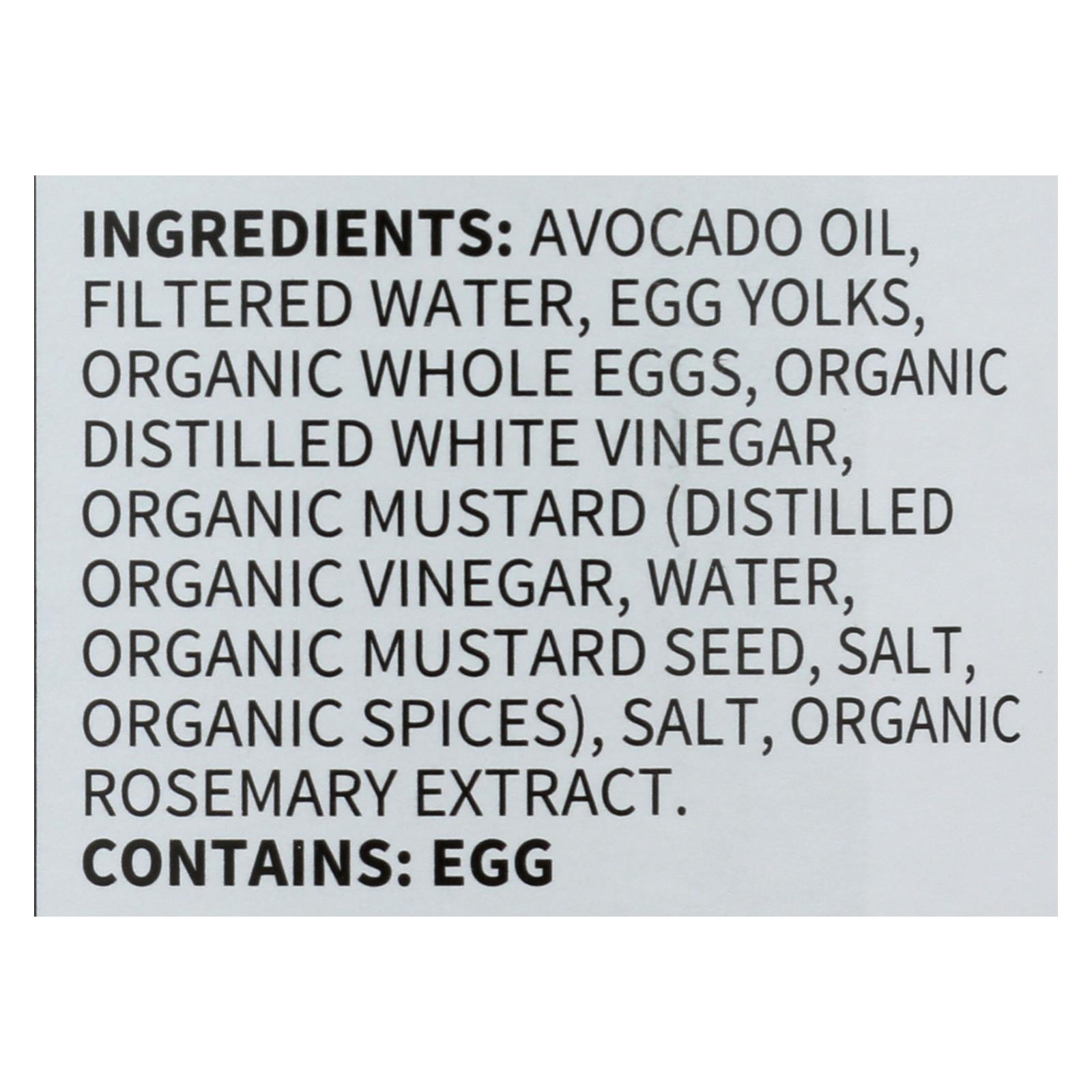 Avocado oil, filtered water, egg yolks, organic whole eggs, organic distilled white vinegar, organic mustard, distilled organic vinegar, water, organic mustard seed, salt, organic spices, organic rosemary extract.