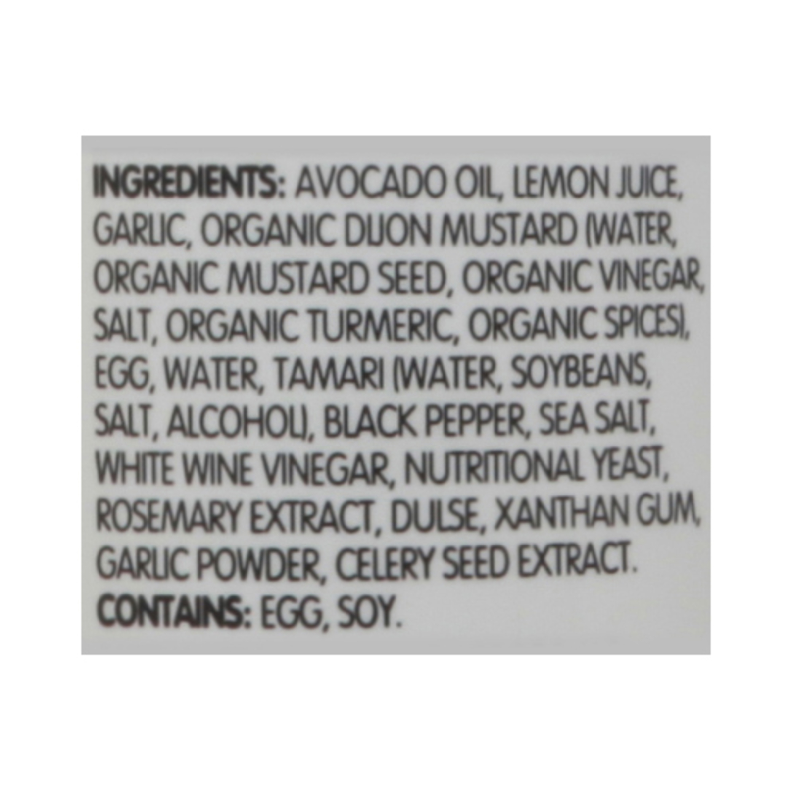 Avocado oil, filtered water, mustard (water, organic mustard seeds, organic vinegar, salt, organic turmeric, organic spices), lemon juice concentrate, egg yolks, tamari (water, soybeans, salt, sugar), dried garlic, less than 2%: salt, distilled vinegar, rosemary extract (for freshness), thyme, black pepper, yeast extract, xanthan gum, citric acid (for freshness).