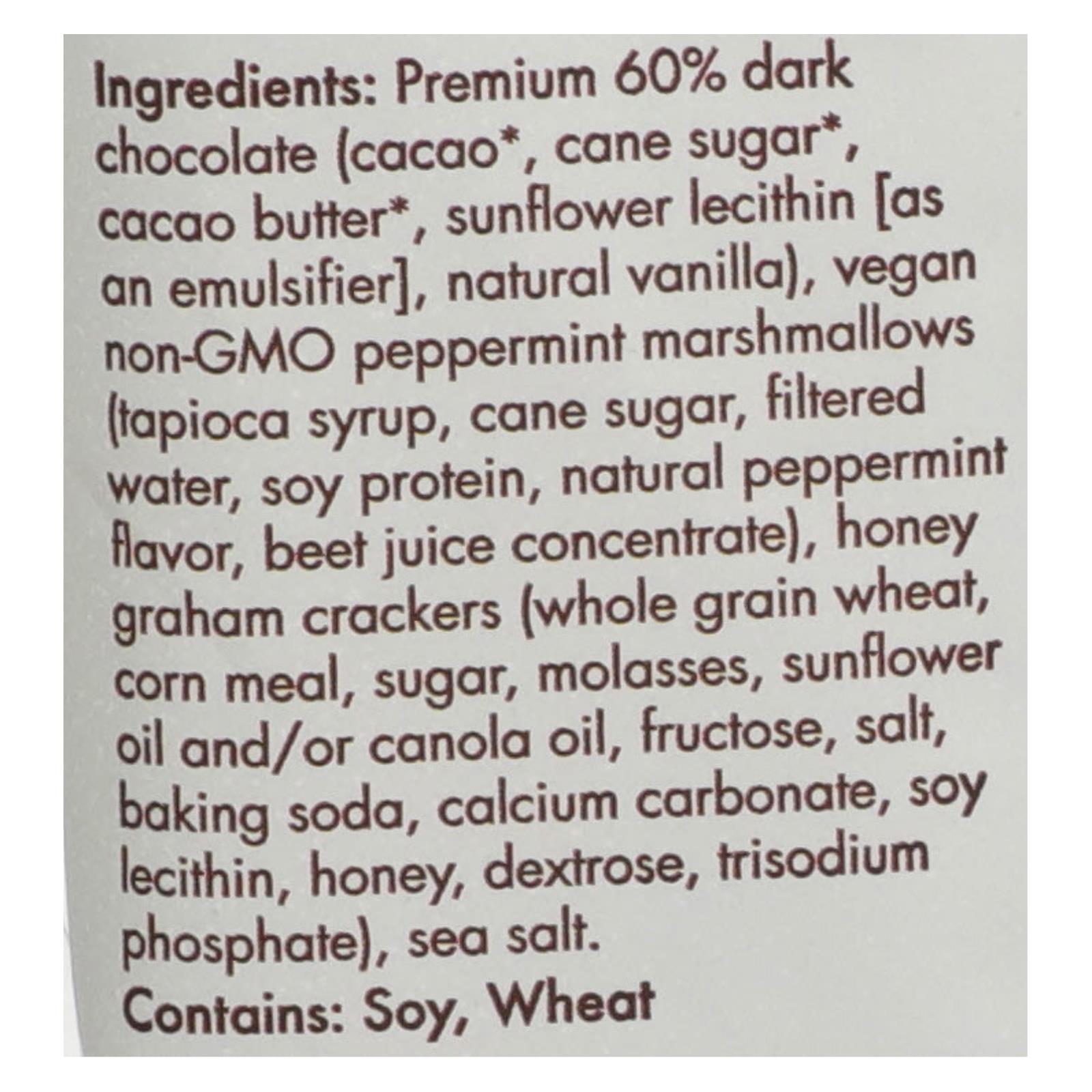 Premium 60% dark chocolate, cacao, cane sugar, cacao butter, sunflower lecithin (as an emulsifier), natural vanilla, vegan non-GMO peppermint marshmallows (tapioca syrup, filtered water, soy protein, natural peppermint flavor, beet juice concentrate), honey graham crackers (whole grain wheat, corn meal, sugar, molasses, sunflower oil and/or canola oil, fructose, salt, baking soda, calcium carbonate, soy lecithin, honey, dextrose, trisodium phosphate, sea salt).