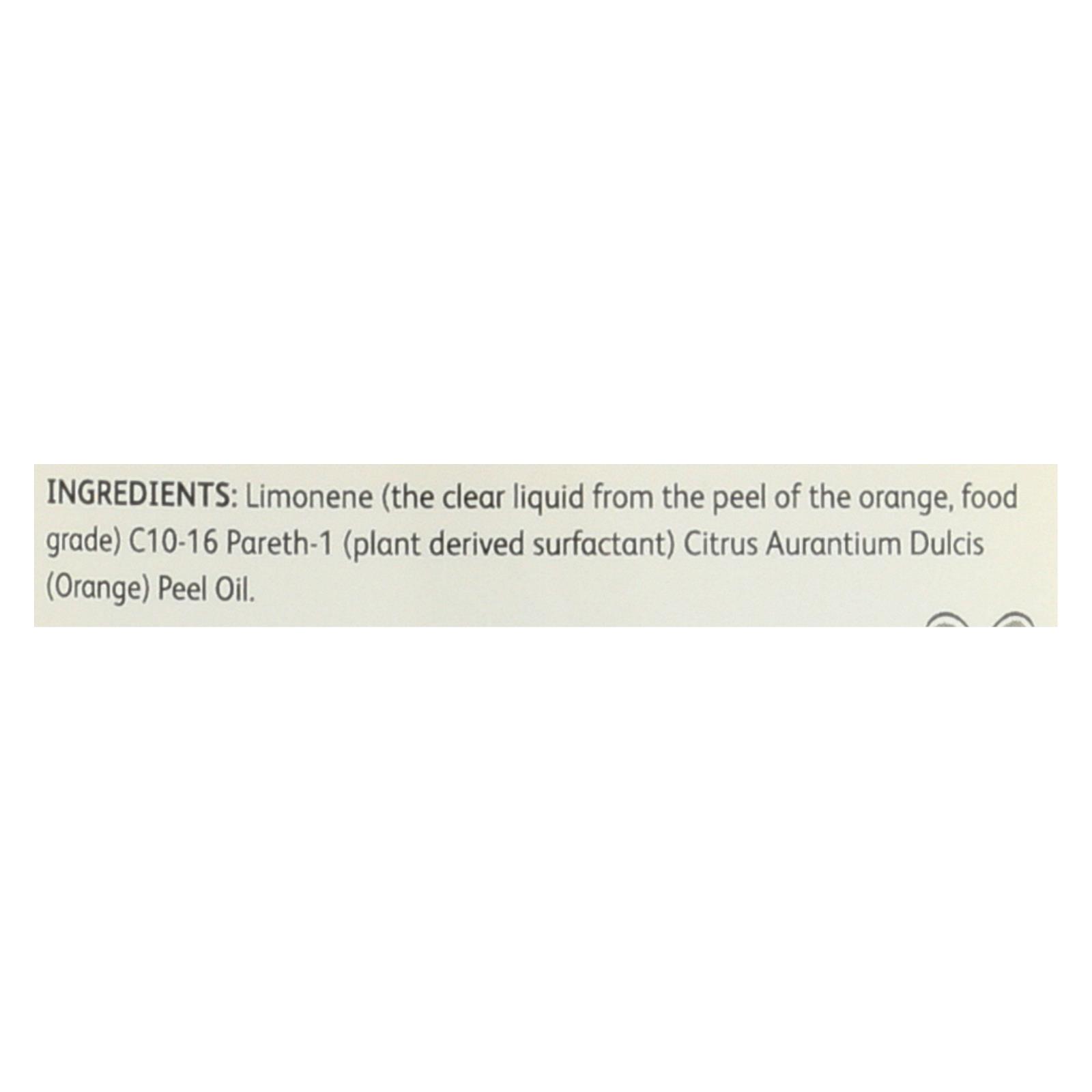 Ingredients: Limonene (the clear liquid from the peel of the orange, food grade), C10-16 Pareth-1 (plant derived surfactant), Citrus Aurantium Dulcis (orange) peel oil.