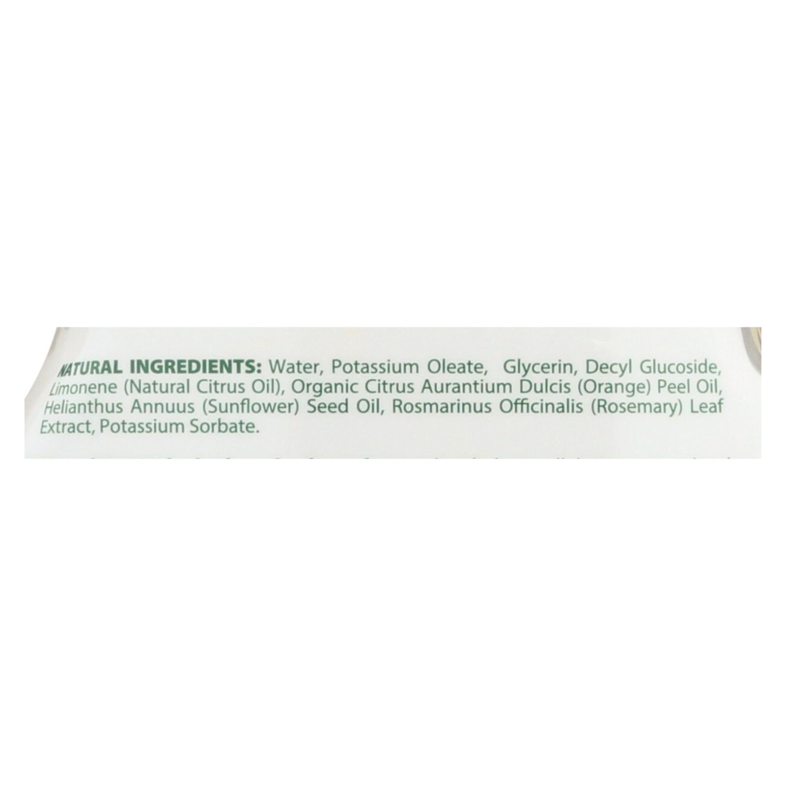 Water, potassium oleate, glycerin, decyl glucoside, limonene, natural citrus oil, organic Citrus aurantium dulcis (orange) peel oil, Helianthus annuus (sunflower) seed oil, Rosmarinus officinalis (rosemary) leaf extract, potassium sorbate.