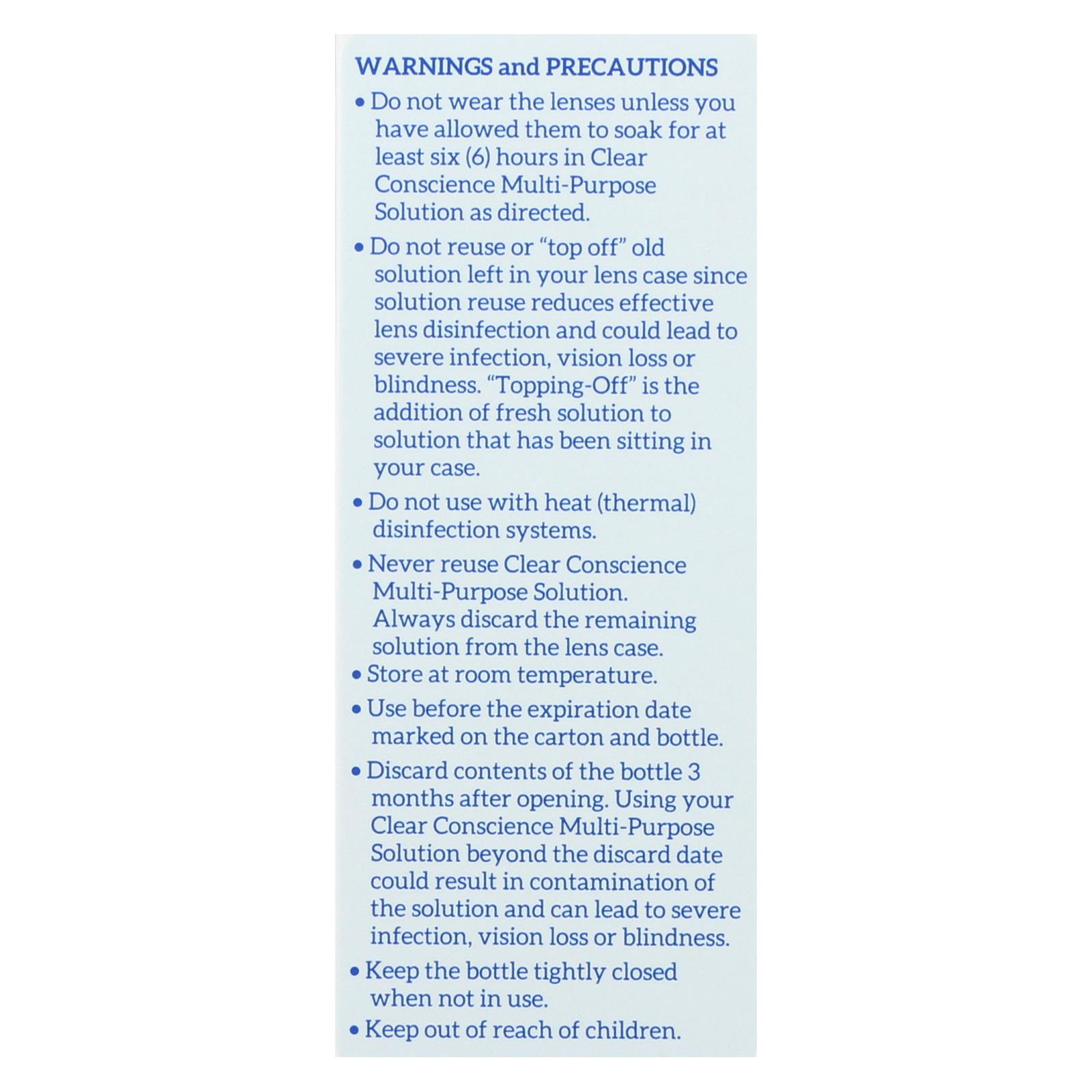 Clear Conscience Multi Purpose Contact Lens Solution is a sterile, isotonic 3 oz travel size for cleaning, disinfecting, and storing soft lenses safely