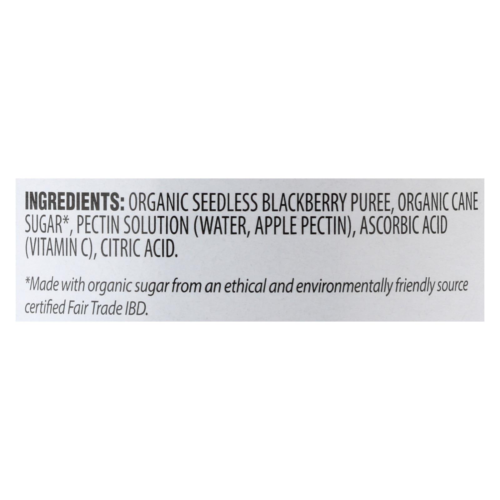 Organic seedless blackberry puree, organic cane sugar, pectin solution (water, apple pectin), ascorbic acid (vitamin C), citric acid.
