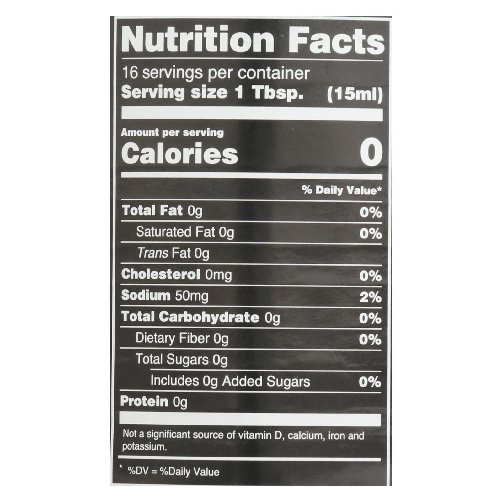 - Serving size: 1 tablespoon; approximately 16 servings per 8 fl oz bottle