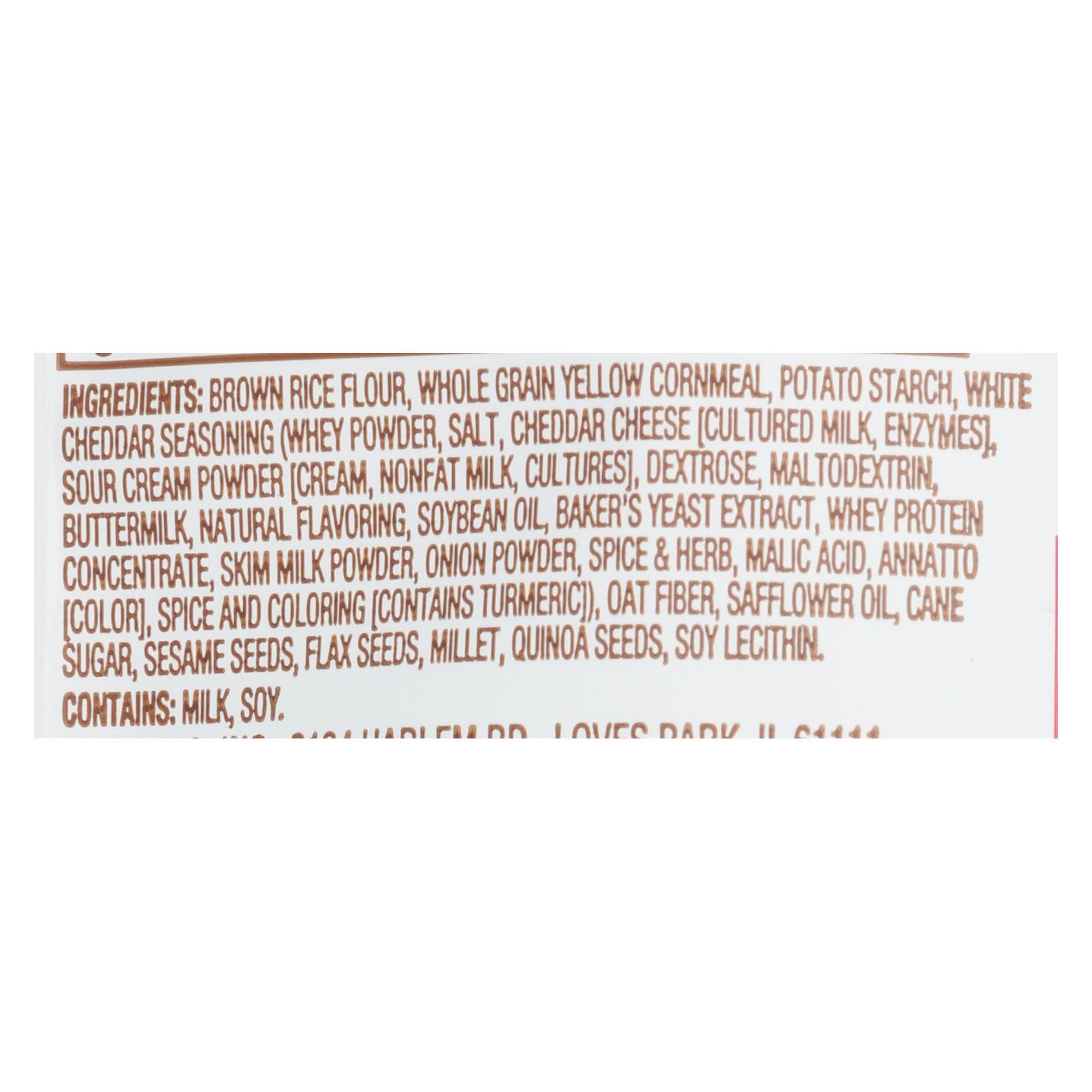 brown rice flour, whole grain yellow cornmeal, potato starch, white cheddar seasoning (whey powder, salt, cheddar cheese [cultured milk, enzymes], sour cream powder [cream, nonfat milk, cultures], dextrose, maltodextrin, buttermilk, natural flavoring, soybean oil, baker’s yeast extract, whey protein concentrate, skim milk powder, onion powder, spice & herb, malic acid, annatto [color], spice and coloring [contains turmeric]), oat fiber, safflower oil, cane sugar, sesame seeds, flax seeds, millet, quinoa