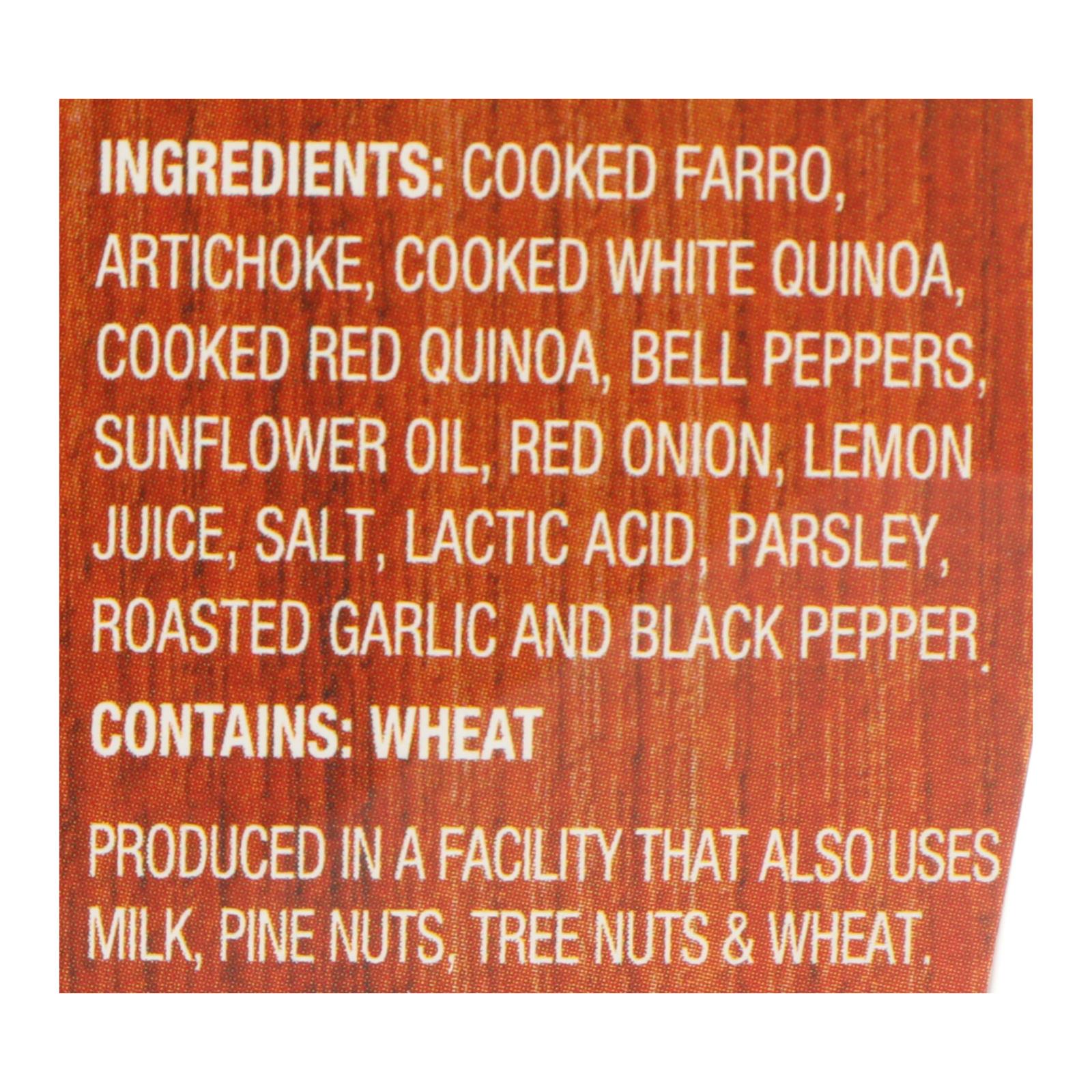 Cooked farro, artichoke, cooked white quinoa, cooked red quinoa, bell peppers, sunflower oil, red onion, lemon juice, salt, lactic acid, parsley, roasted garlic, black pepper.