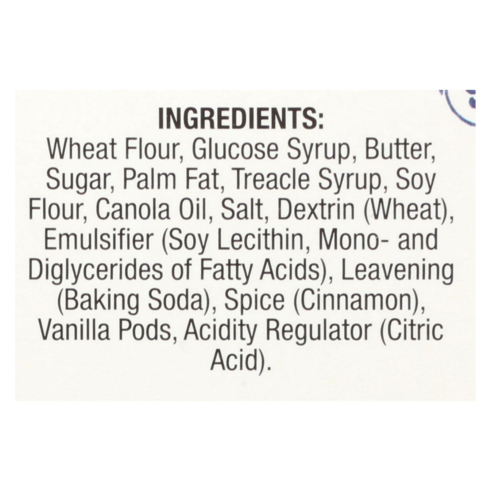 ingredients : glucose syrup;wheat flour;sugar;palm oil;butter;molasses;soy flour;canola oil;salt;wheat dextrin;soy lecithin;baking soda;cinnamon;citric acid;vanilla bean;mono- and diglycerides of fatty acids