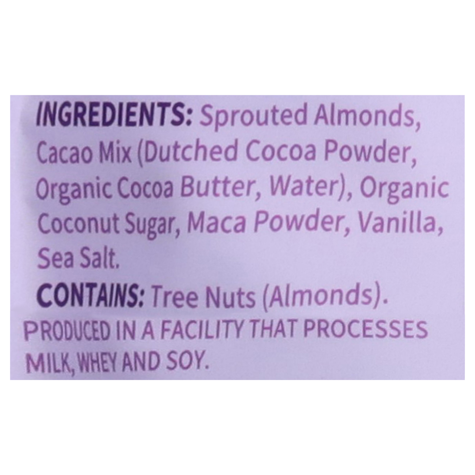 ingredients : sprouted almonds;cacao mix (dutched cocoa powder, organic cocoa butter, water);organic coconut sugar;maca powder;vanilla;sea salt