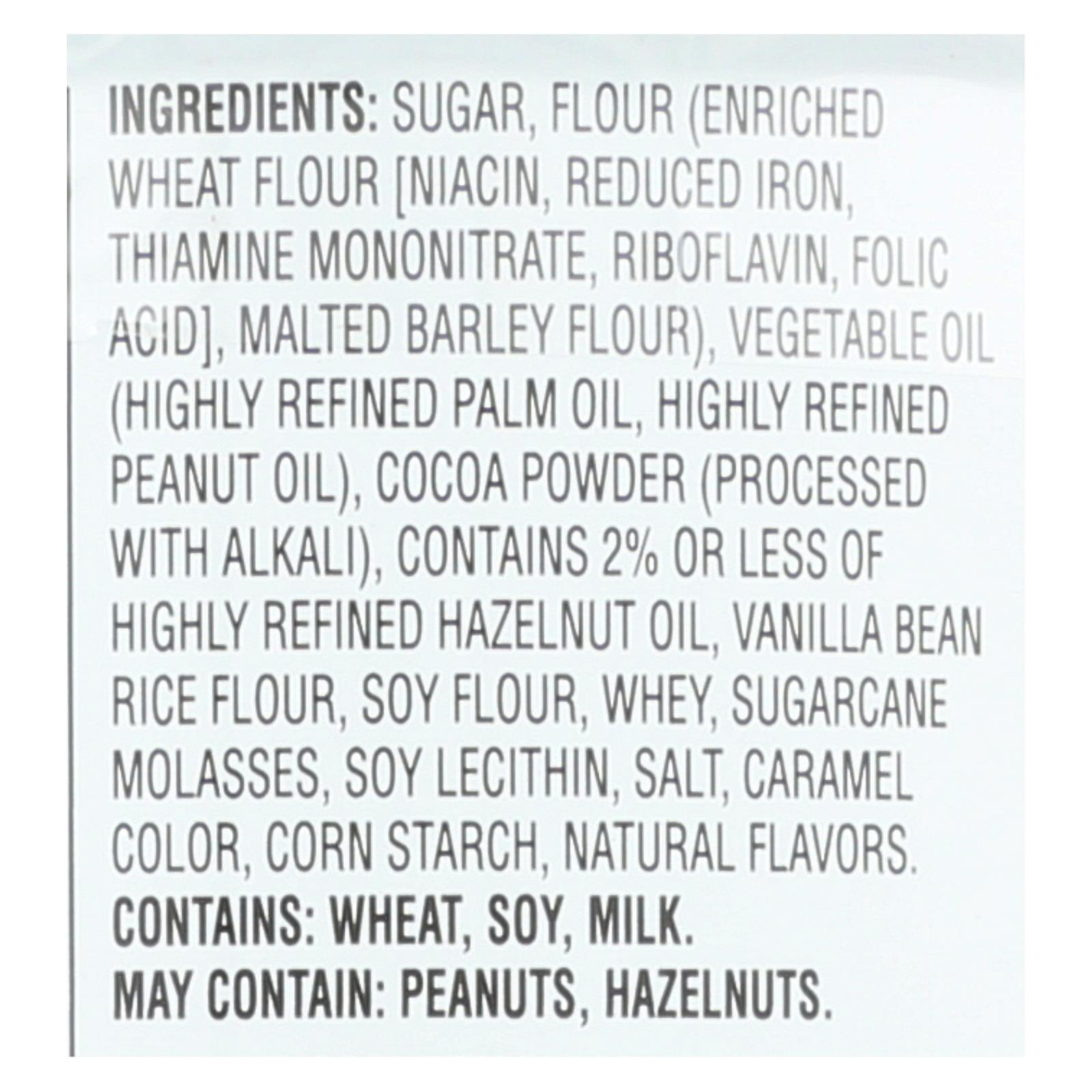 ingredients : sugar;flour;enriched wheat flour [niacin;reduced iron;thiamine mononitrate;riboflavin;folic acid];malted barley flour;vegetable oil;highly refined palm oil;highly refined peanut oil;cocoa powder;processed with alkali;contains 2% or less of highly refined hazelnut oil;vanilla bean rice flour;soy flour;whey;sugarcane molasses;soy lecithin;salt;caramel color;corn starch;natural flavors