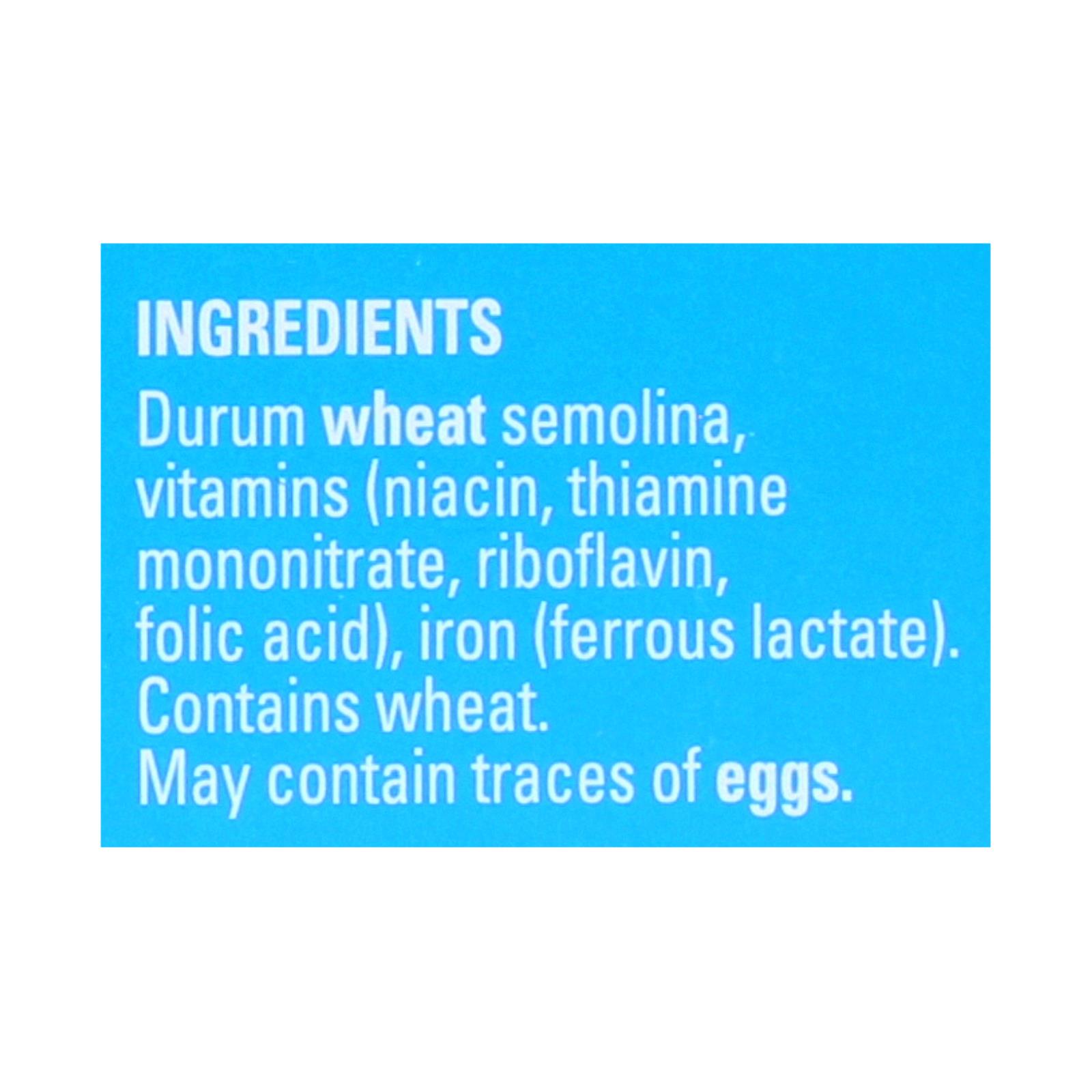 Durum wheat semolina, vitamins (niacin, thiamine mononitrate, riboflavin, folic acid), iron (ferrous lactate).