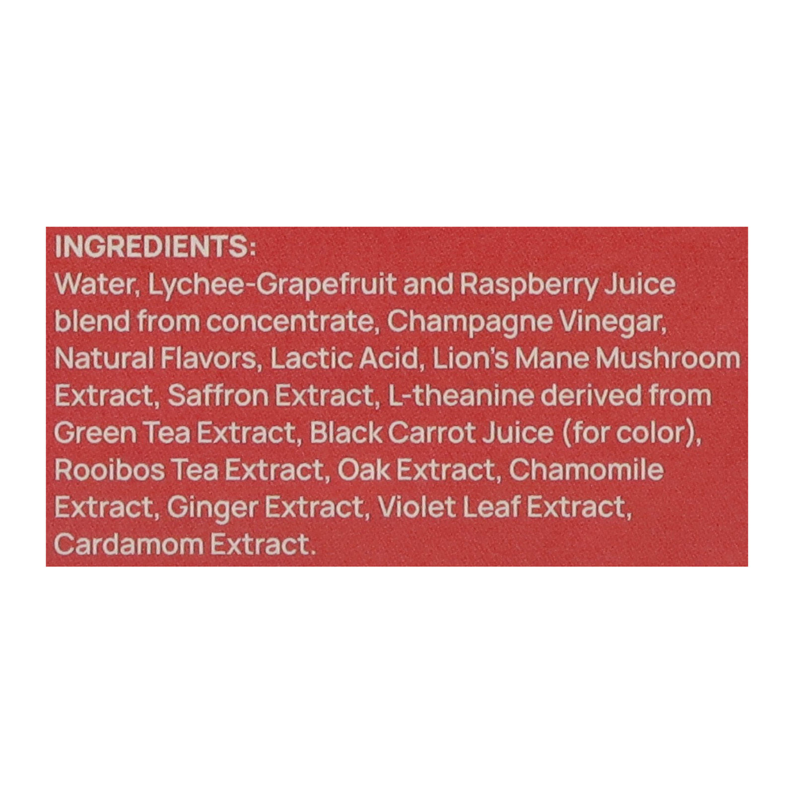 Water; lychee-grapefruit and raspberry juice blend from concentrate; champagne vinegar; natural flavors; lactic acid; lion’s mane mushroom extract; saffron extract; l-theanine derived from green tea extract; black carrot juice (for color); rooibos tea extract; oak extract; chamomile extract; ginger extract; cardamom extract.