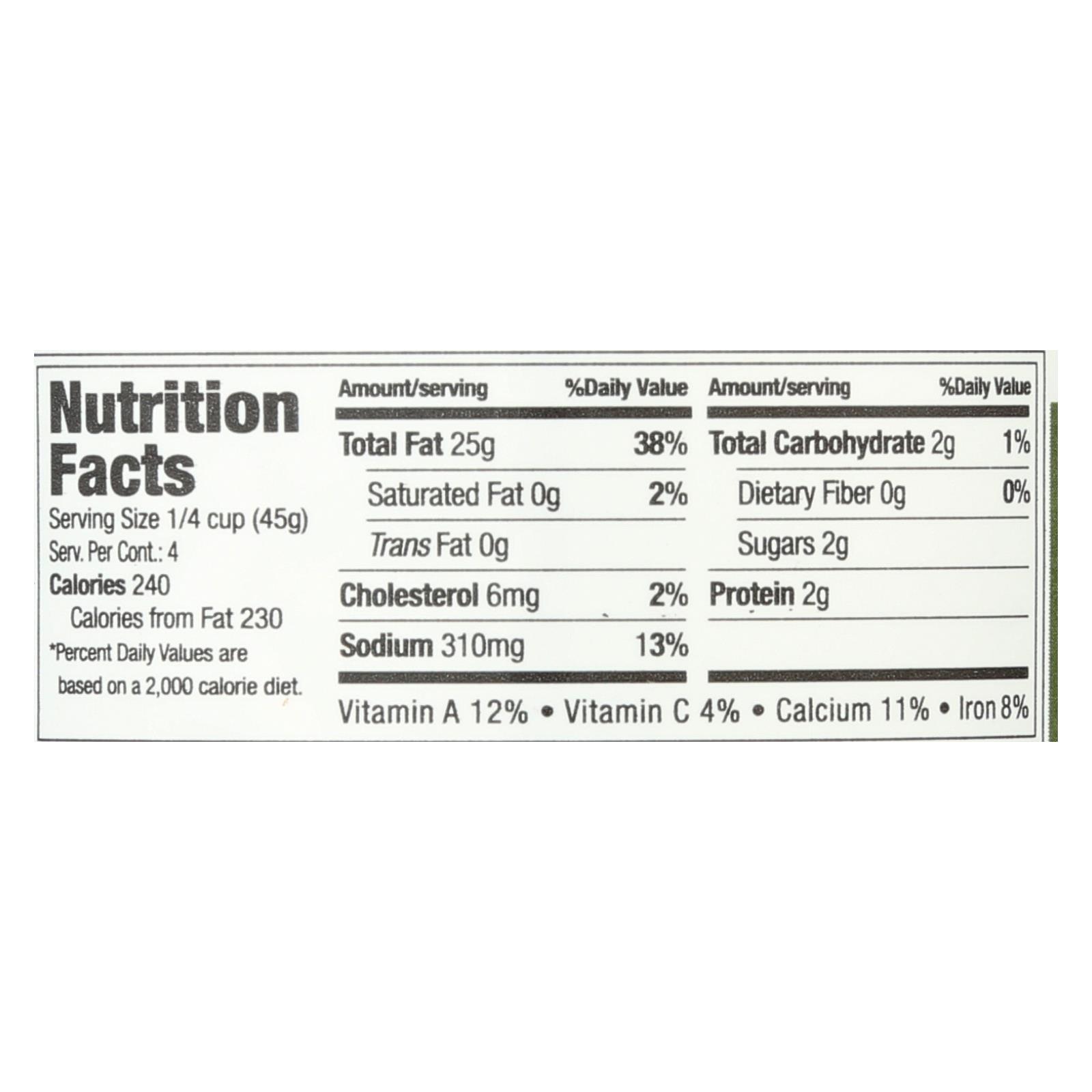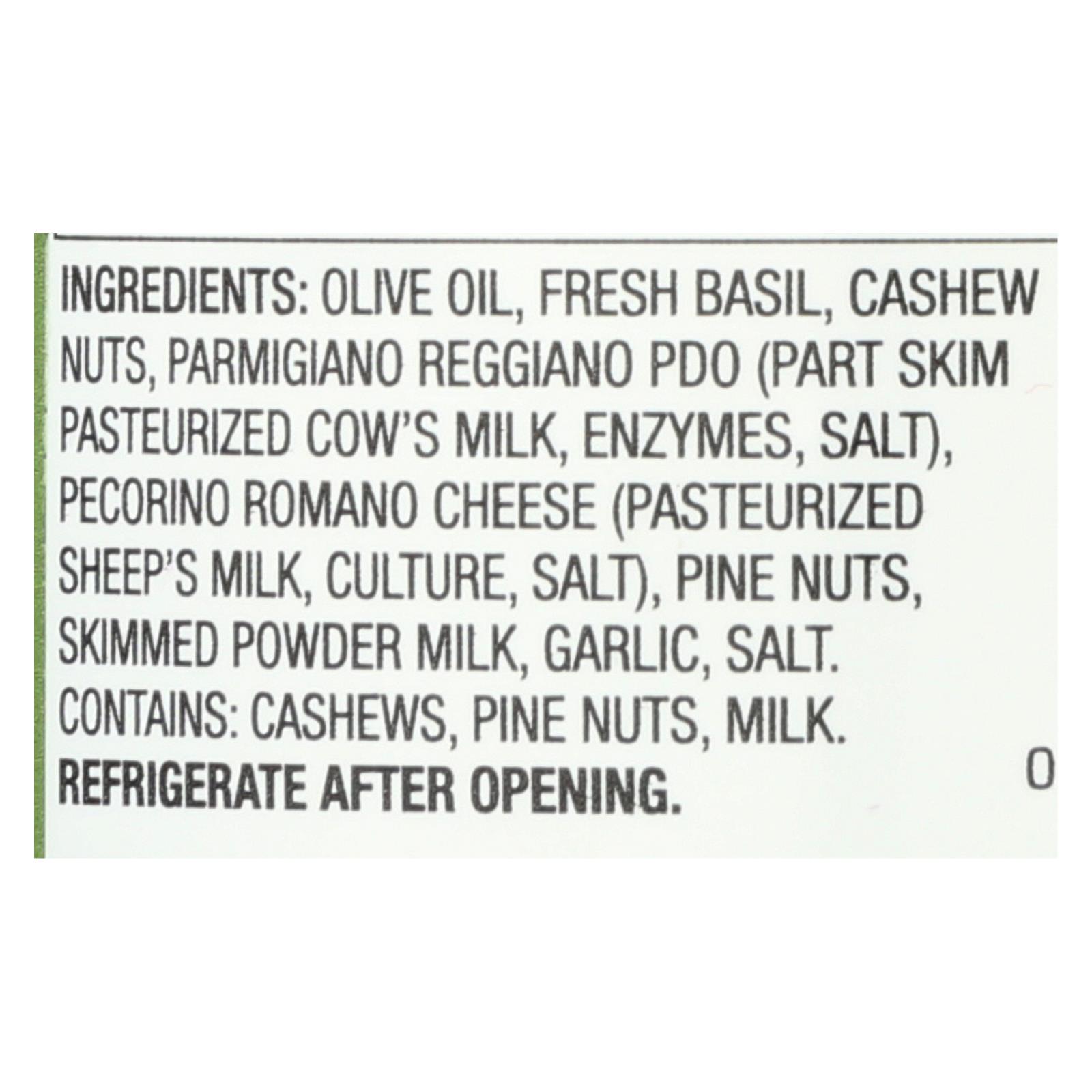 Olive oil, fresh basil, cashew nuts, Parmigiano Reggiano PDO (part skim pasteurized cow’s milk, enzymes, salt), Pecorino Romano cheese (pasteurized sheep’s milk, culture, salt), pine nuts, skimmed powder milk, garlic, salt.