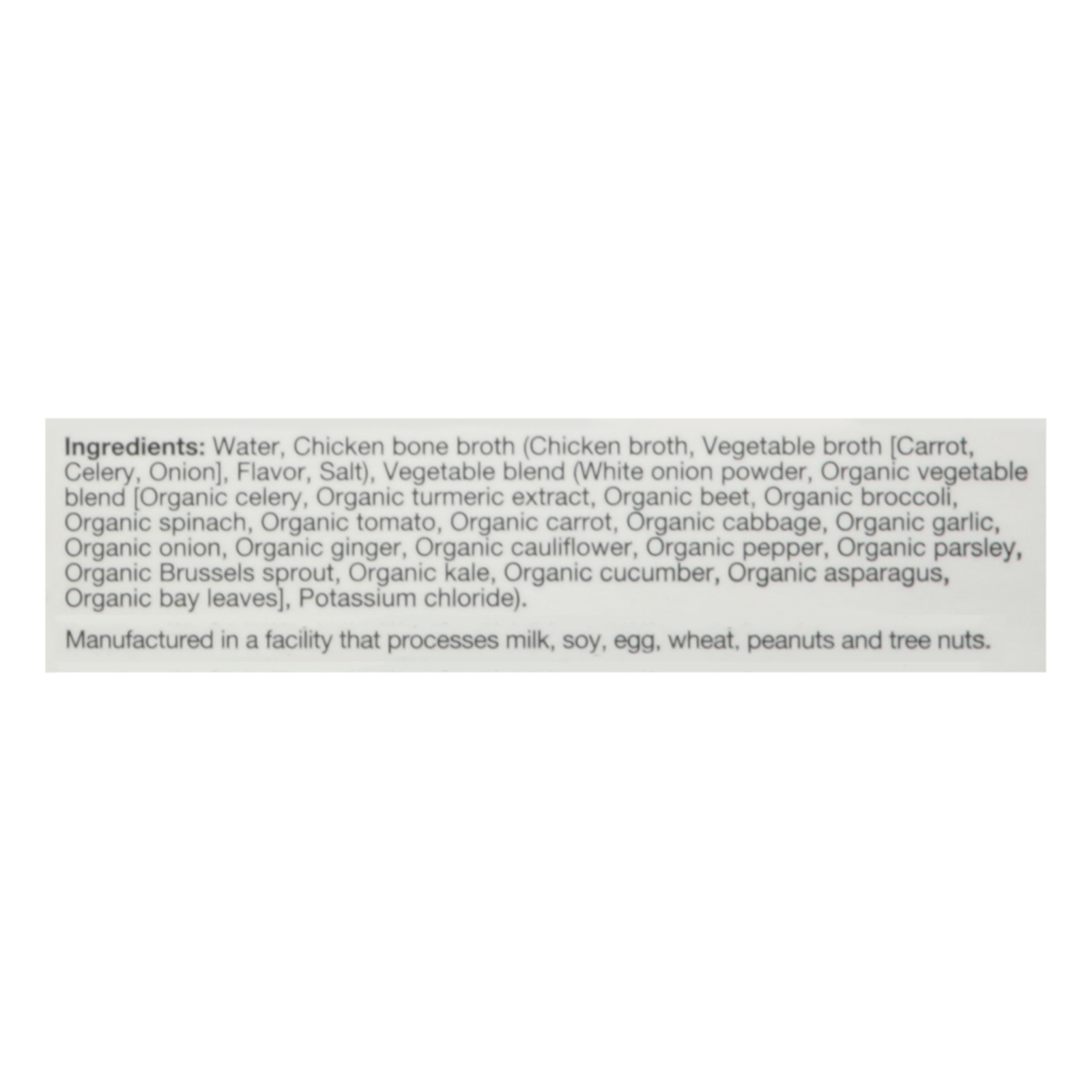 ingredients : water;chicken bone broth (chicken broth, vegetable broth [carrot, celery, onion], flavor, salt);vegetable blend (white onion powder, organic vegetable blend [organic celery, organic turmeric extract, organic beet, organic broccoli, organic spinach, organic tomato, organic carrot, organic cabbage, organic garlic, organic onion, organic ginger, organic cauliflower, organic pepper, organic parsley, organic brussels sprout, organic kale, organic cucumber, organic asparagus, organic bay leaves], pota