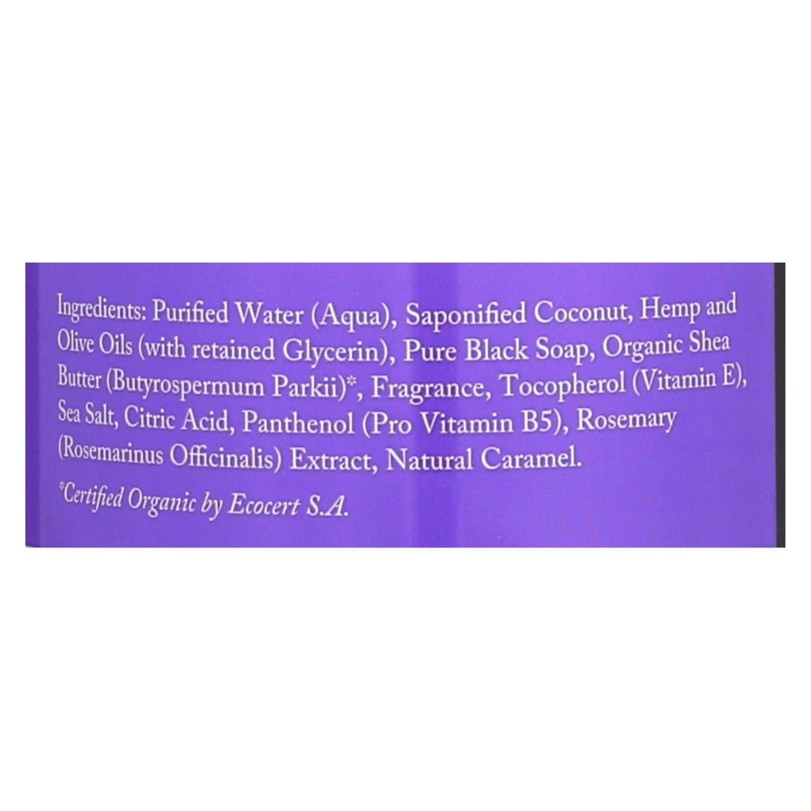 Purified water, aqua, saponified coconut, hemp and olive oils (with retained glycerin), pure black soap, organic shea butter (butyrospermum parkii), fragrance, tocopherol (vitamin E), sea salt, citric acid, panthenol (pro vitamin B5), rosemary (rosemarinus officinalis) extract, natural caramel.
