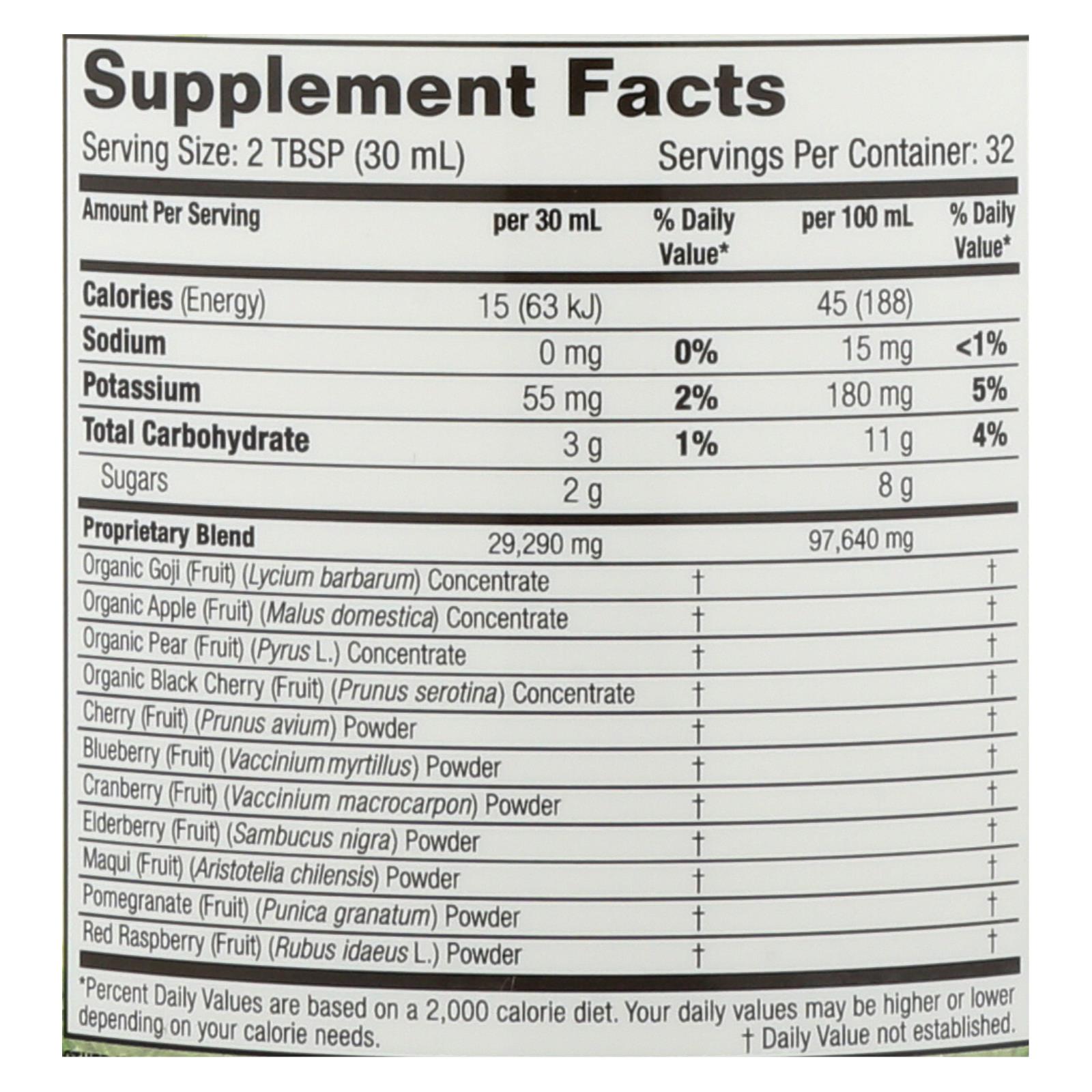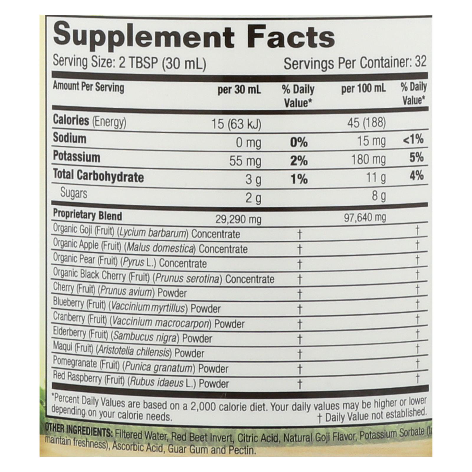 This blend features goji berry juice, traditionally used in herbal wellness for its rich nutrient profile. It’s enhanced with a proprietary mix of elderberry, black cherry, and maqui fruit powder-fruits commonly used to support overall vitality. The formula is naturally rich in calcium, selenium, phosphorus, amino acids, and other vital nutrients.