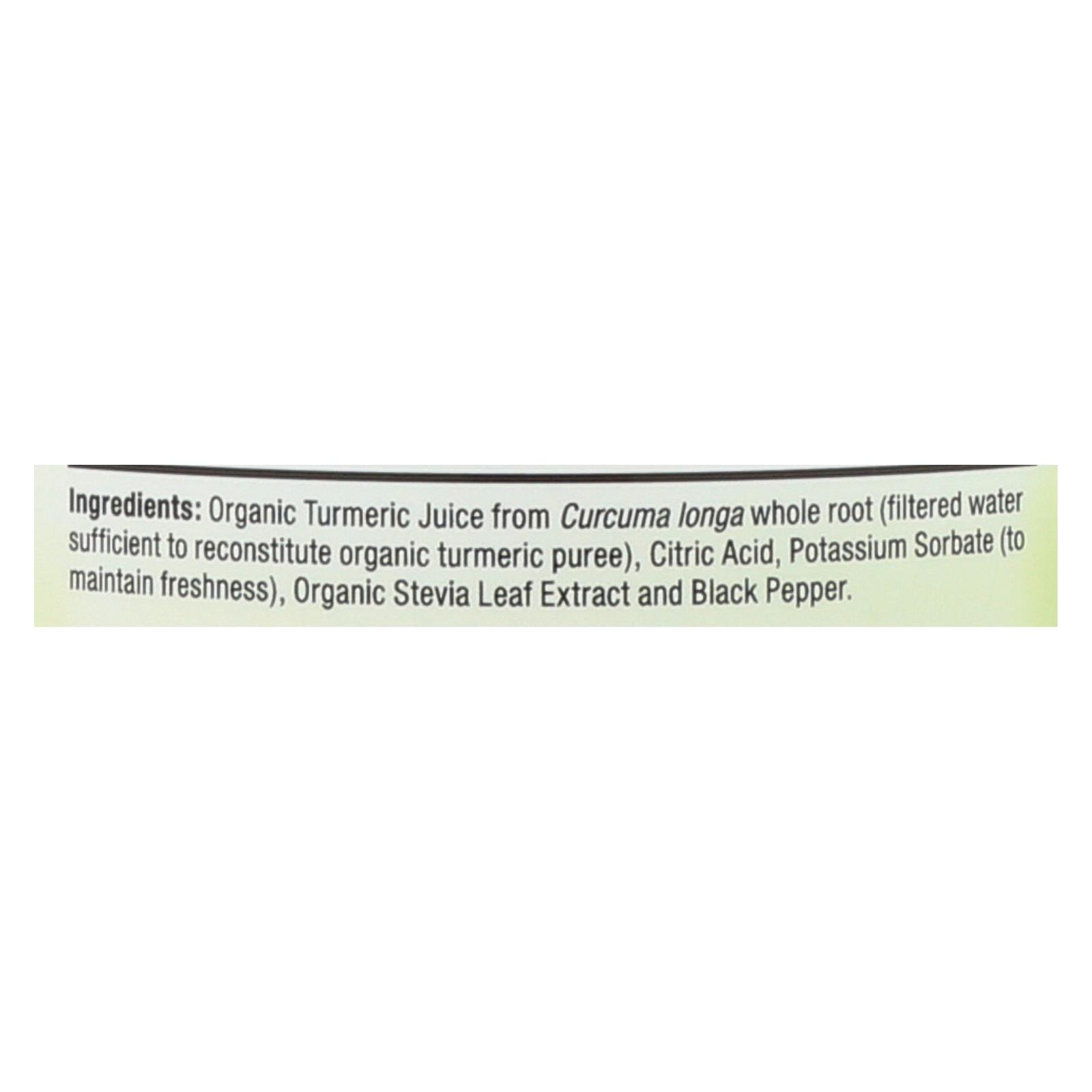 Organic turmeric juice from Curcuma longa whole root, filtered water (sufficient to reconstitute organic turmeric puree), citric acid, potassium sorbate (to maintain freshness), organic stevia leaf extract, black pepper.