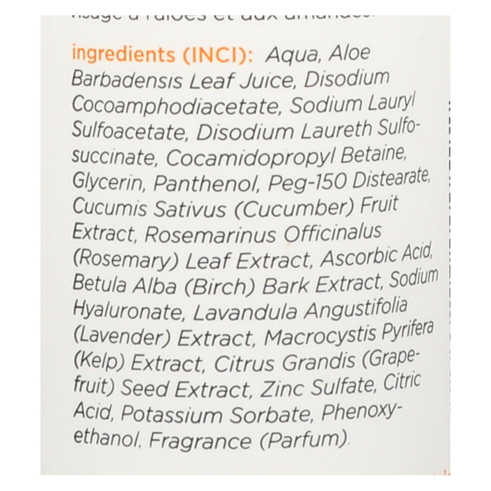 Aqua, Aloe Barbadensis Leaf Juice, Disodium Cocoamphodiacetate, Sodium Lauryl Sulfoacetate, Disodium Laureth Sulfosuccinate, Cocamidopropyl Betaine, Glycerin, Panthenol, PEG-150 Distearate, Cucumis Sativus (Cucumber) Fruit Extract, Rosmarinus Officinalis (Rosemary) Leaf Extract, Ascorbic Acid, Betula Alba (Birch) Bark Extract, Sodium Hyaluronate, Lavandula Angustifolia (Lavender) Extract, Macrocystis Pyrifera (Kelp), Citrus Grandis (Grapefruit) Seed Extract, Zinc Sulfate, Citric Acid, Potassium Sorbate, Phenoxyethanol.