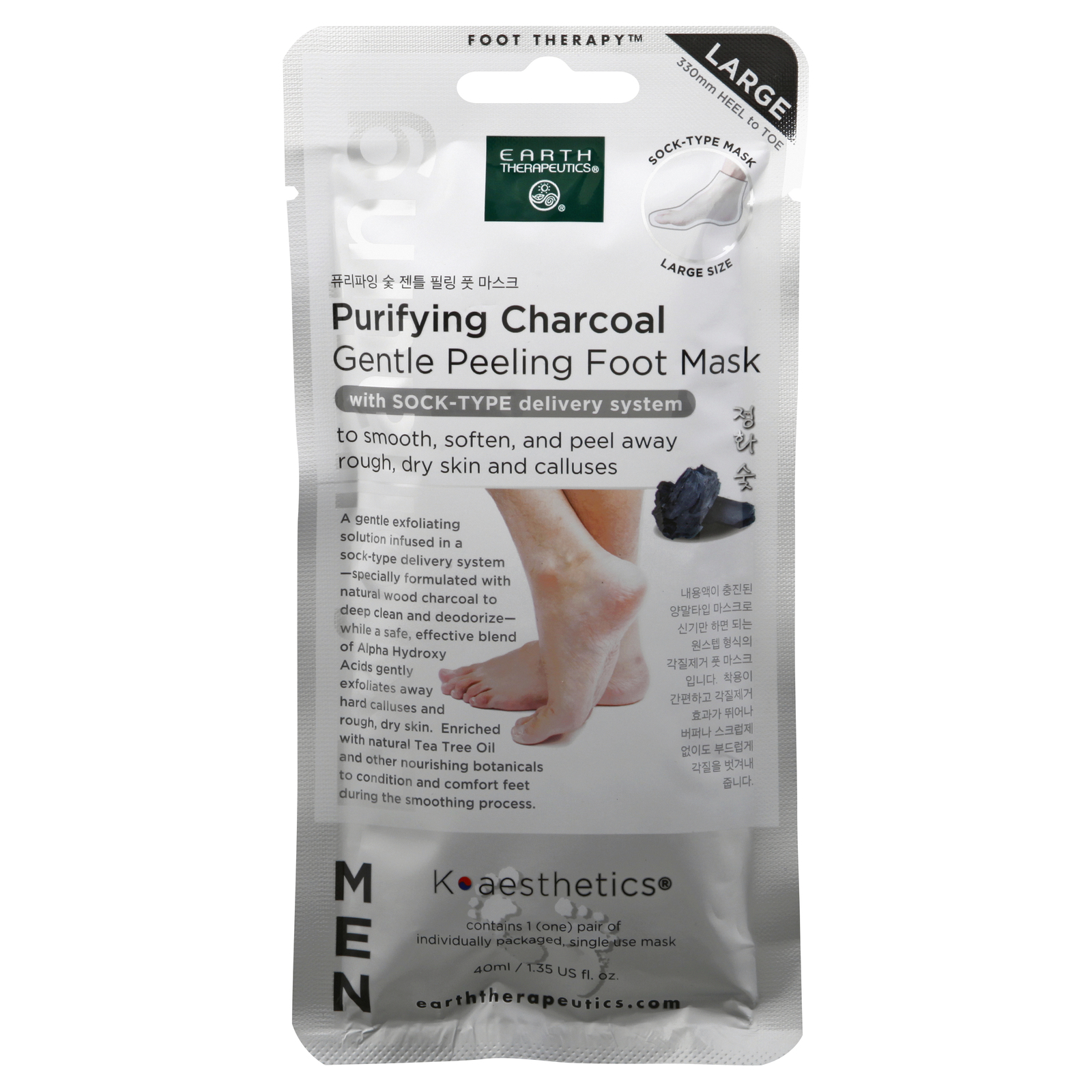 Paraben free. No mineral oil. No lauryl/laureth sulfate. No artificial colors. Men. Foot therapy. Large 330mm heel to toe. With sock-type delivery system. To smooth, soften, and peel away rough, dry skin and calluses. Contains 1 (one) pair of individually packaged single use mask. A gentle exfoliating solution infused in a sock – type delivery system – specially formulated with natural wood charcoal to deep clean and deodorize – while a safe, effective blend of alpha hydroxy acids gently exfoliates away hard calluses and rough, dry skin. Enriched with natural tea tree oil and other nourishing botanicals to condition and comfort feet during the smoothing process. Each treatment gently peels away hard calluses over time and will lead to visibly smooth results within 2 weeks. Sock – type delivery system: protective outer shell is made of recyclable, low density pe. Inner lining (the layer infused with formula) is made of recyclable non-woven, spunlace fabric. Fits most foot sizes: measures 330mm from heel to toe contains one (1) pair of individually packaged, single-use sock-type toot masks. Each individually packaged pair contains 40ml / 1.35 us fl. Oz. Earththerapeutics.com. Cruelty-free. No animal testing. Dispose of properly. Korean beauty. Manufactured in korea. Designed by earth therapeutics.