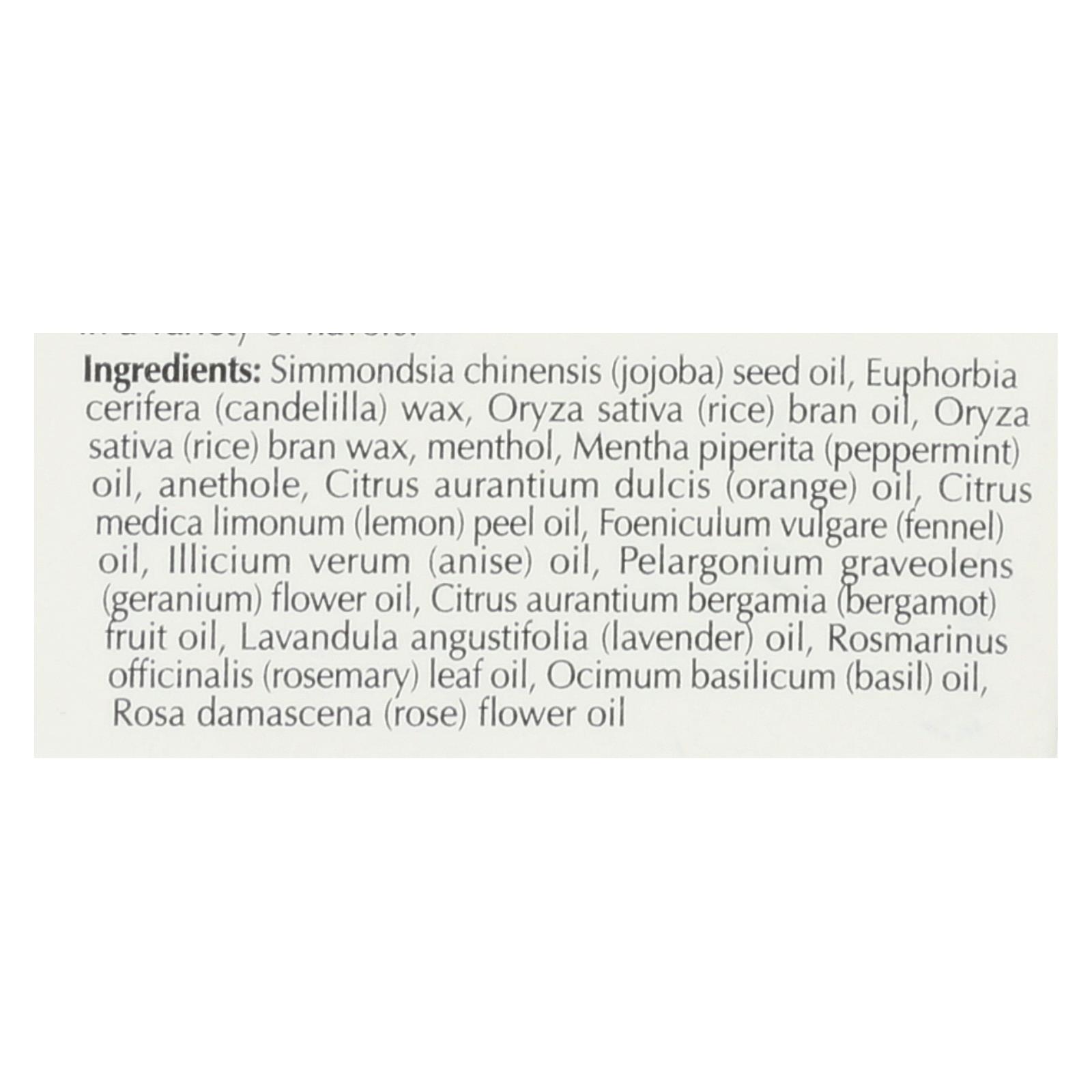 Simmondsia chinensis (jojoba) seed oil, euphorbia cerifera (candelilla) wax, oryza sativa (rice) bran oil, rice bran wax, menthol, mentha piperita (peppermint) oil, anethole, citrus aurantium dulcis (orange), citrus medica limonum (lemon) peel oil, foeniculum vulgare (fennel), illicium verum (anise), pelargonium graveolens (geranium) flower oil, citrus aurantium bergamia (bergamot) fruit oil, lavandula angustifolia (lavender), rosmarinus officinalis (rosemary) leaf oil, ocimum basilicum (basil), rosa damascena (rose).