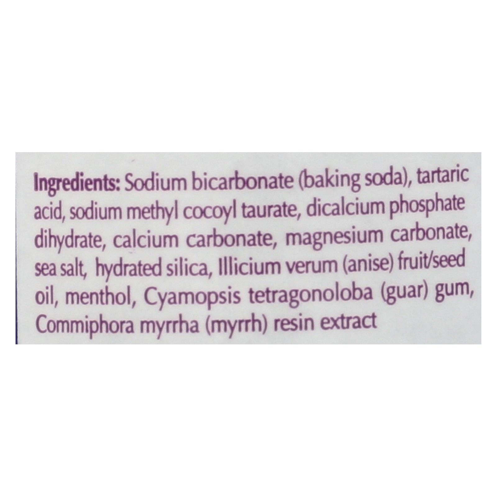 ingredients : sodium bicarbonate;baking soda;tartaric acid;sodium methyl cocoyl taurate;dicalcium phosphate dihydrate;calcium carbonate;magnesium carbonate;sea salt;hydrated silica;illicium verum;anise;fruit/seed oil;menthol;cyamopsis tetragonoloba;guar;gum;commiphora myrrha;myrrh;resin extract