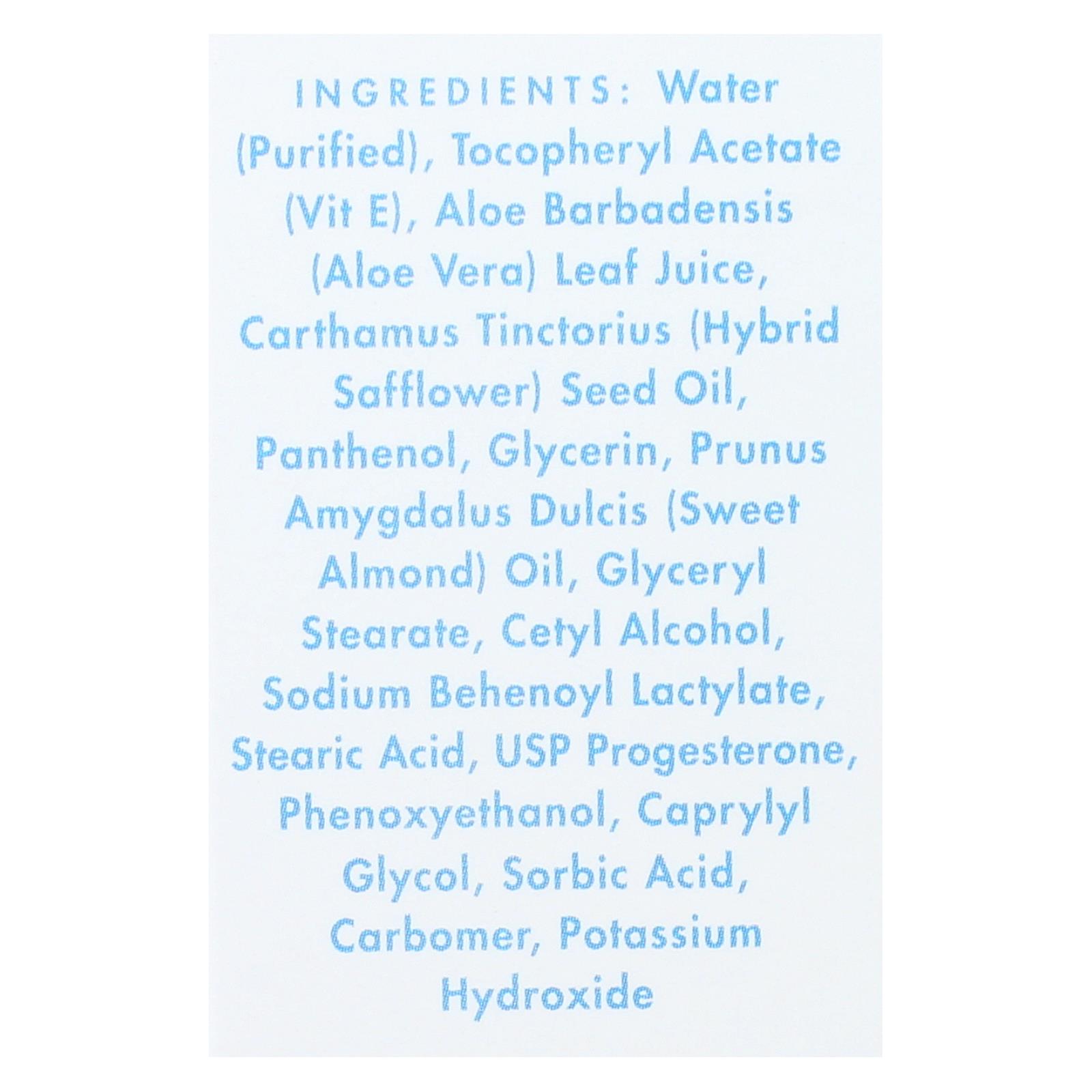 ingredients : water;purified;tocopheryl acetate;vit e;aloe barbadensis;aloe vera;leaf juice;carthamus tinctorius;hybrid safflower;seed oil;panthenol;glycerin;prunus amygdalus dulcis;sweet almond;oil;glyceryl stearate;cetyl alcohol;sodium behenoyl lactylate;stearic acid;usp progesterone;phenoxyethanol;caprylyl glycol;sorbic acid;carbomer;potassium hydroxide