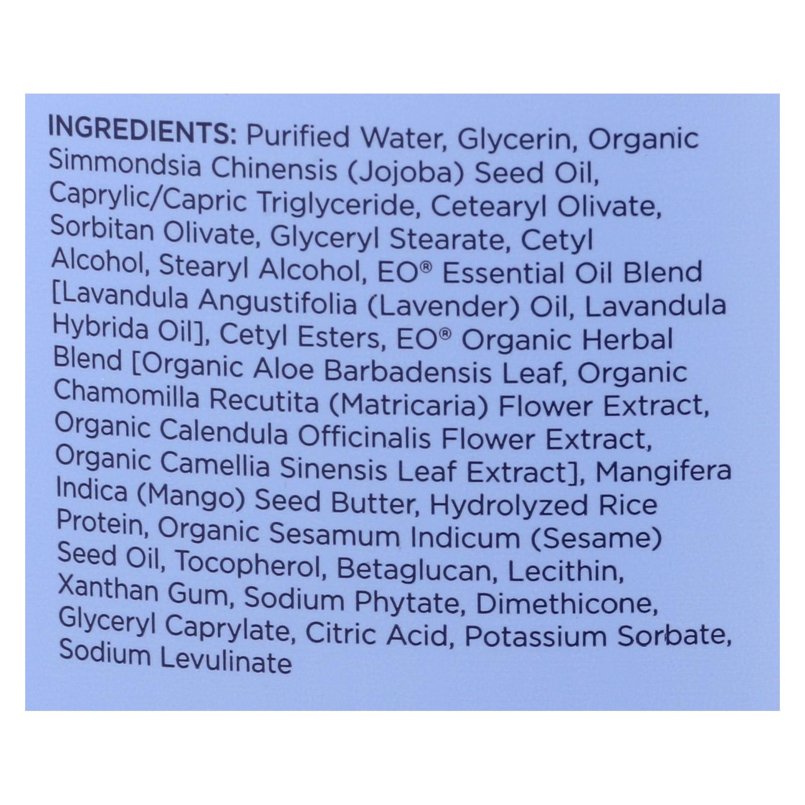 Purified water, glycerin, organic simmondsia chinensis (jojoba) seed oil, caprylic/capric triglyceride, cetearyl olivate, sorbitan olivate, glyceryl stearate, cetyl alcohol, stearyl alcohol, EO® essential oil blend (lavandula angustifolia [lavender] oil, lavandula hybrida oil), cetyl esters, EO® organic herbal blend (organic aloe barbadensis leaf, organic chamomilla recutita [matricaria] flower extract, organic calendula officinalis flower extract, organic camellia sinensis leaf extract), mangifera indica (mango) seed.