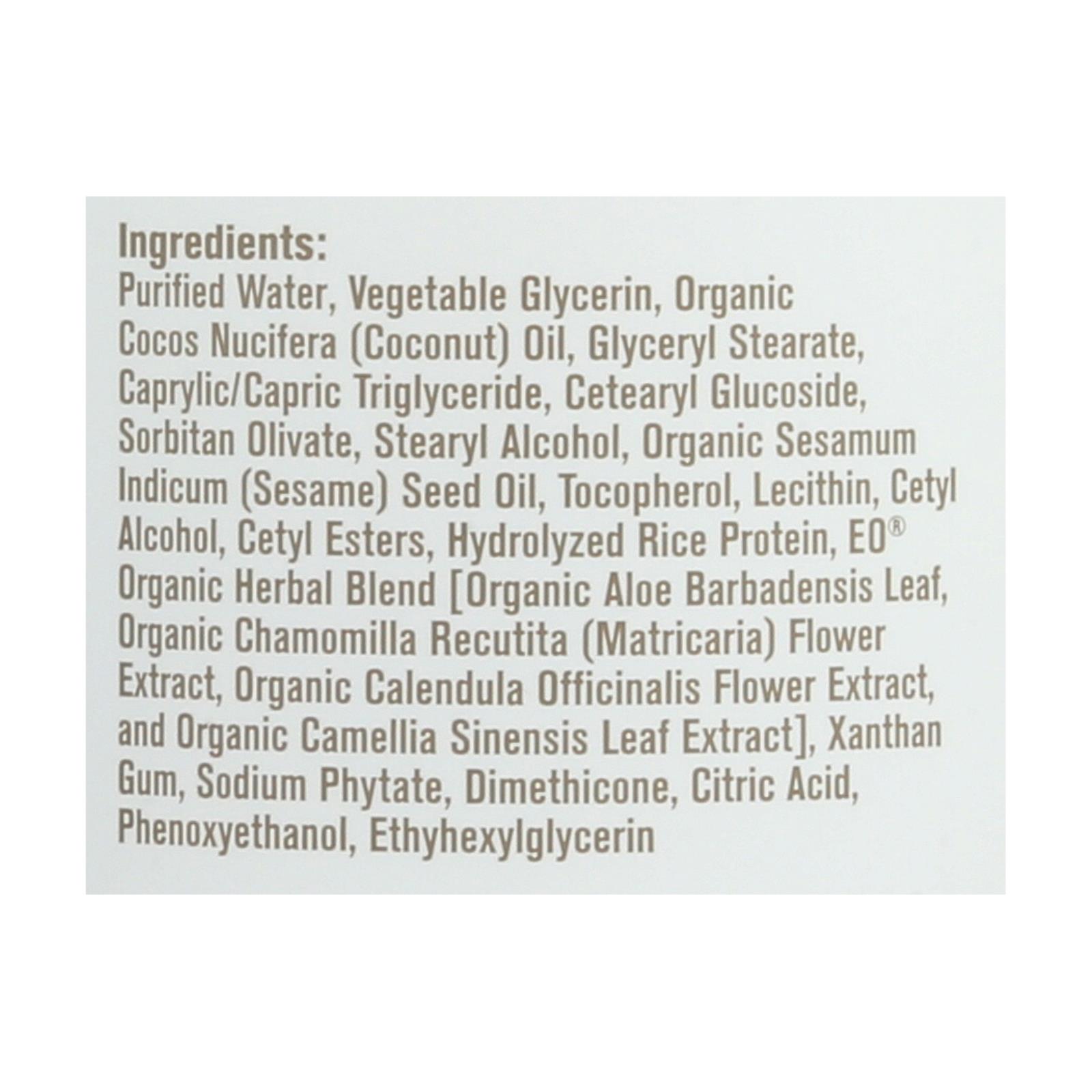 ingredients : purified water;vegetable glycerin;organic cocos nucifera;coconut;oil;glyceryl stearate;caprylic/capric triglyceride;cetearyl glucoside;sorbitan olivate;stearyl alcohol;organic sesamum lndicum;sesame;seed oil;tocopherol;lecithin;cetyl alcohol;cetyl esters;hydrolyzed rice protein;eo® organic herbal blend [organic aloe barbadensis leaf;organic chamomilla recutita [matricaria] flower extract;organic calendula offcinalis flower extract and organic camellia sinensis leaf extract];xanthan gum;sodium ph