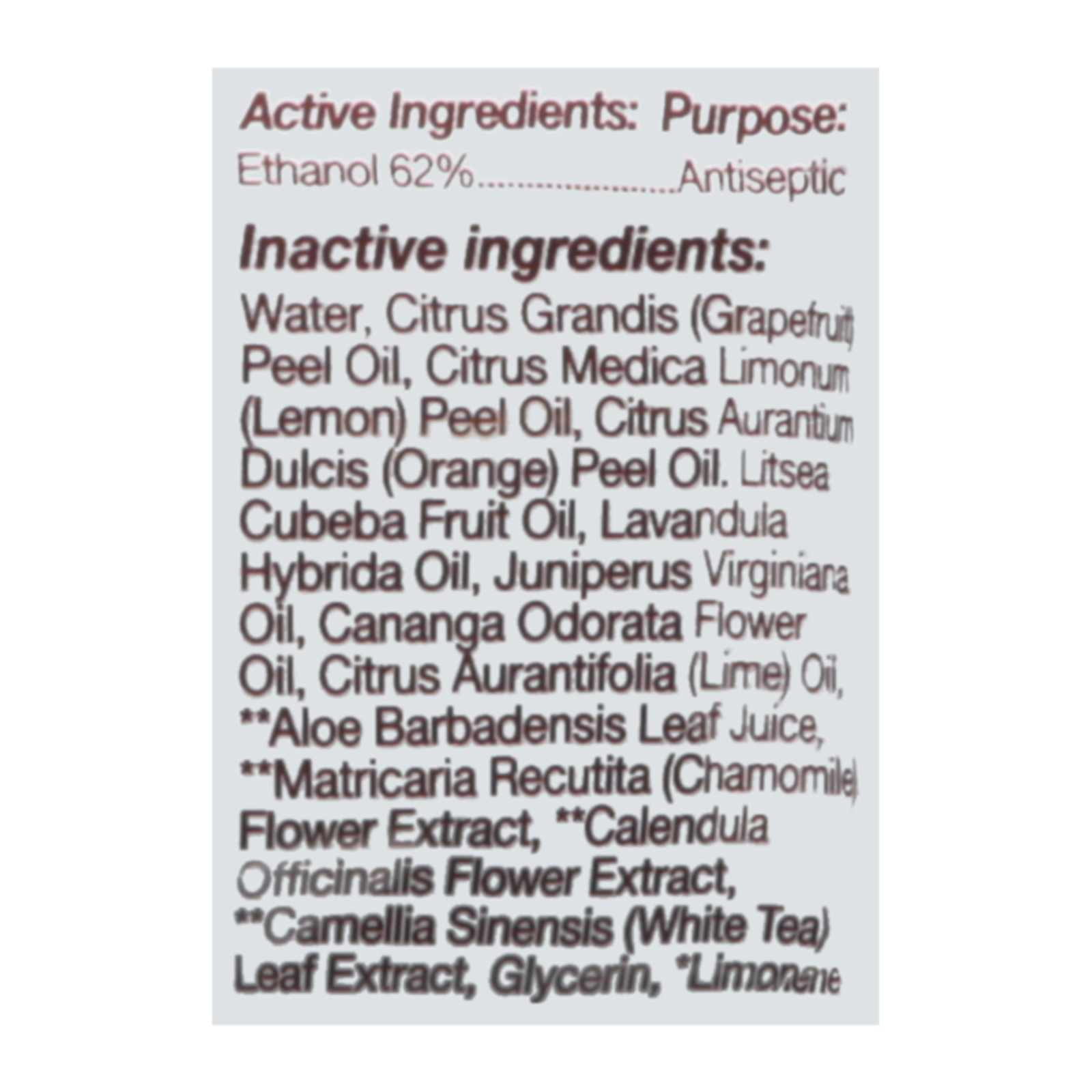 Ethanol 62% (purpose: antiseptic), water, citrus grandis (grapefruit) peel oil, citrus medica limonum (lemon) peel oil, citrus aurantium dulcis (orange) peel oil, litsea cubeba fruit oil, lavandula hybrida oil, juniperus virginiana oil, cananga odorata flower oil, citrus aurantifolia (lime) oil, aloe barbadensis leaf, matricaria recutita (chamomile) flower extract, calendula officinalis flower extract, camellia sinensis (white tea) leaf extract, glycerin, limonene.