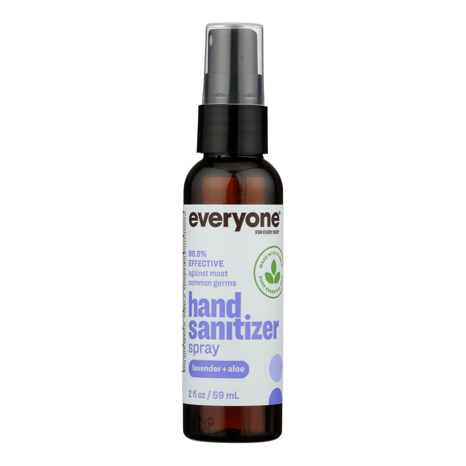 Everyone hand sanitizer spray, lavender+aloe is never tested on animals. This product is gentle enough for the recommended repeated use. Everyone hand sanitizer spray, lavender+aloe is 99.9% effective against most common germs. This product can help to decrease bacteria on skin, is certified gluten-free and non-gmo. Everyone hand sanitizer spray, lavender+aloe comes packaged for your convenience in a recyclable, plastic bottle for easy disposal. Each bottle of everyone hand sanitizer spray, lavender+aloe contains 2 fl. Oz. Of product. Love, everyone.
