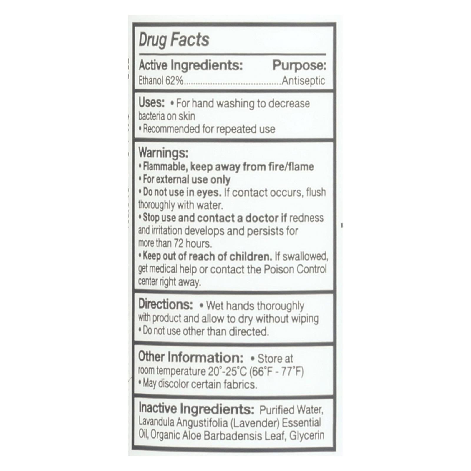ingredients : ethanol 62% purpose: antiseptic;water;lavendula angustifolia (lavender) oil;aloe barbadensis leaf juice;matricaria recutita (chamomile) flower extract;calendula officinalis flower extract;camellia sinensis (white tea) leaf extract;glycerin