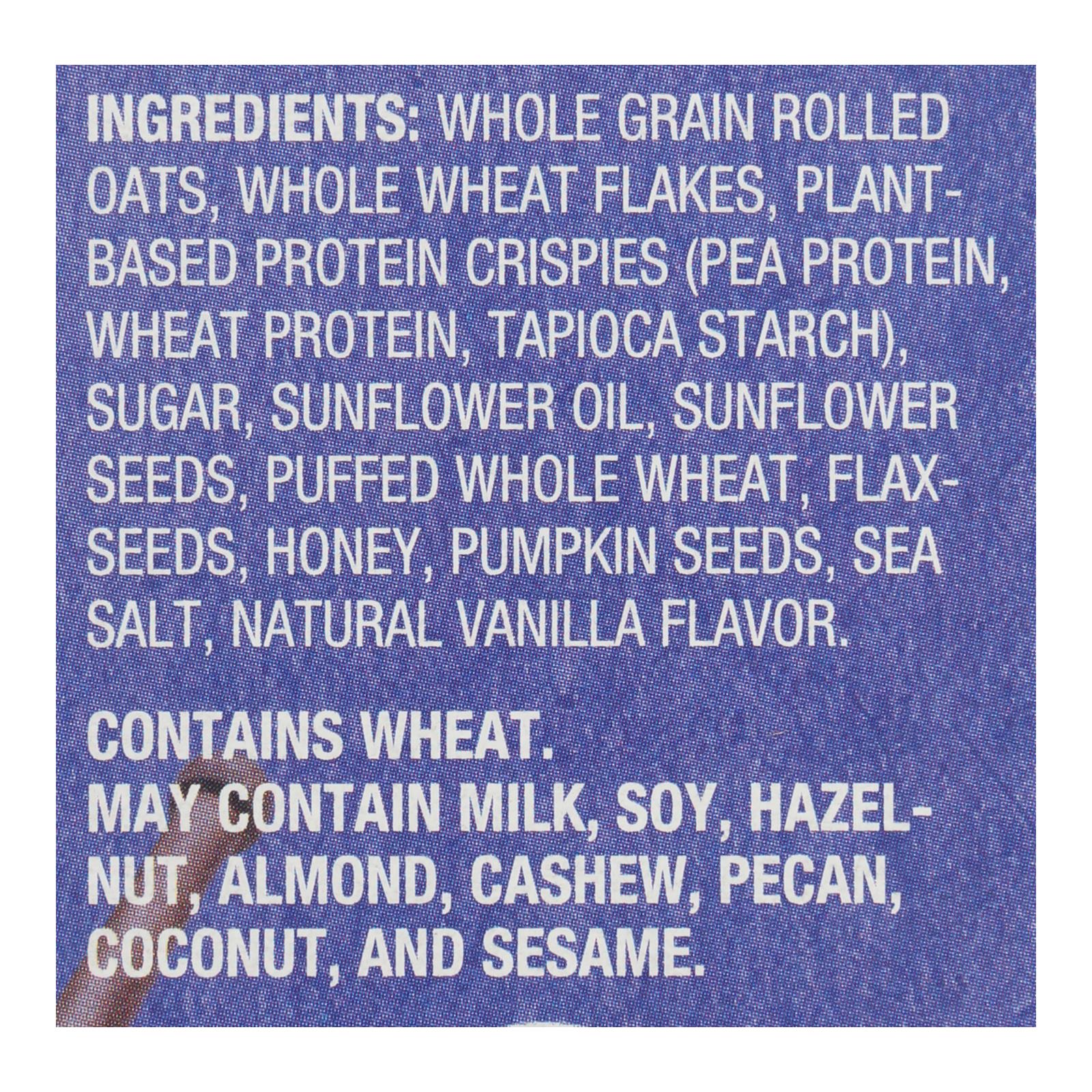 Enjoy the goodness of whole grain rolled oats and whole wheat flakes, combined with plant-based protein crispies made from pea and wheat protein. Sunflower seeds, flax-seeds, and pumpkin seeds add a satisfying crunch and are commonly used in wellness traditions for their natural nutrient content. A touch of honey and natural vanilla flavor rounds out this delicious, nourishing blend.