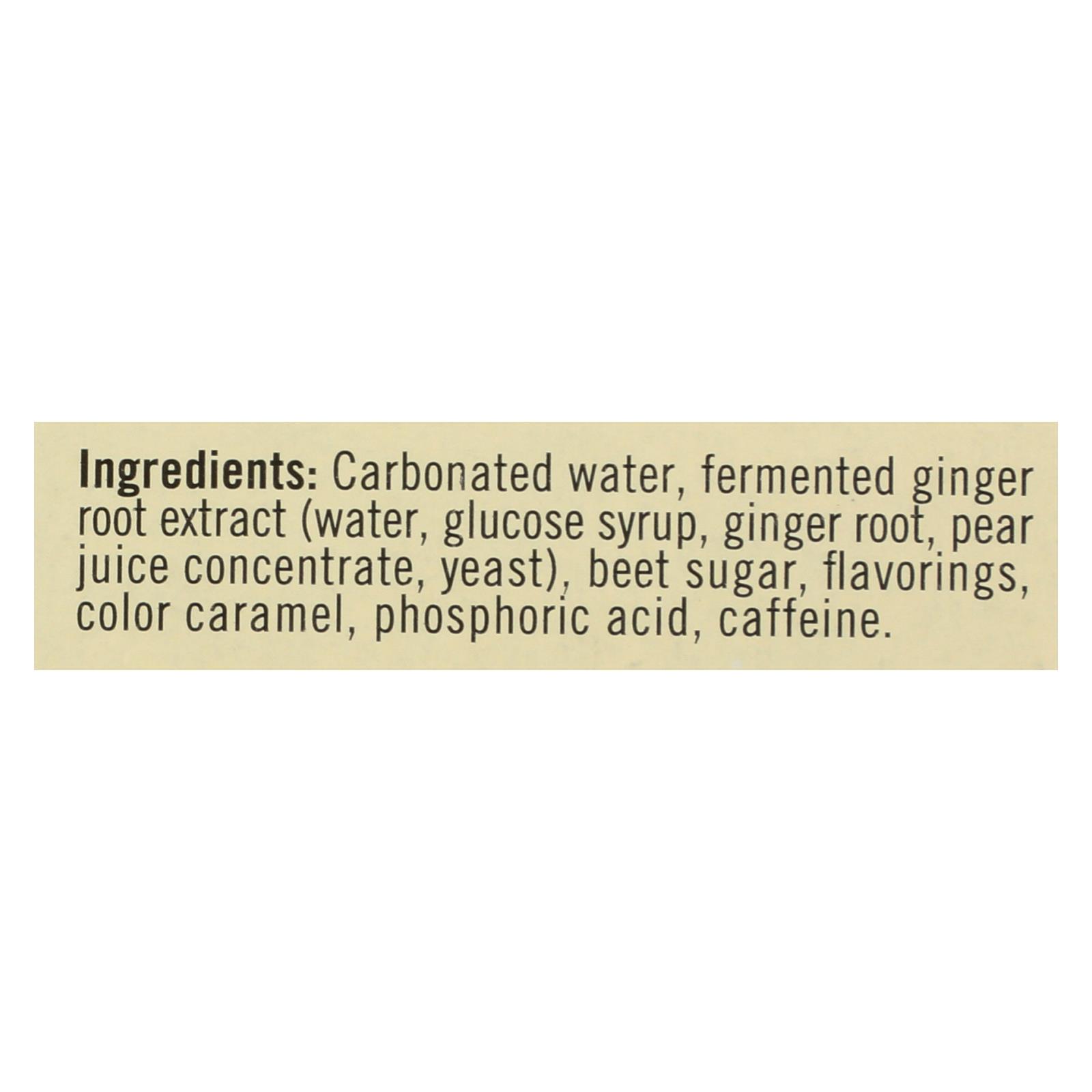 Carbonated water, fermented ginger root extract (water, glucose syrup, ginger root, pear juice concentrate, yeast), beet sugar, caramel color, natural flavors, phosphoric acid, caffeine.