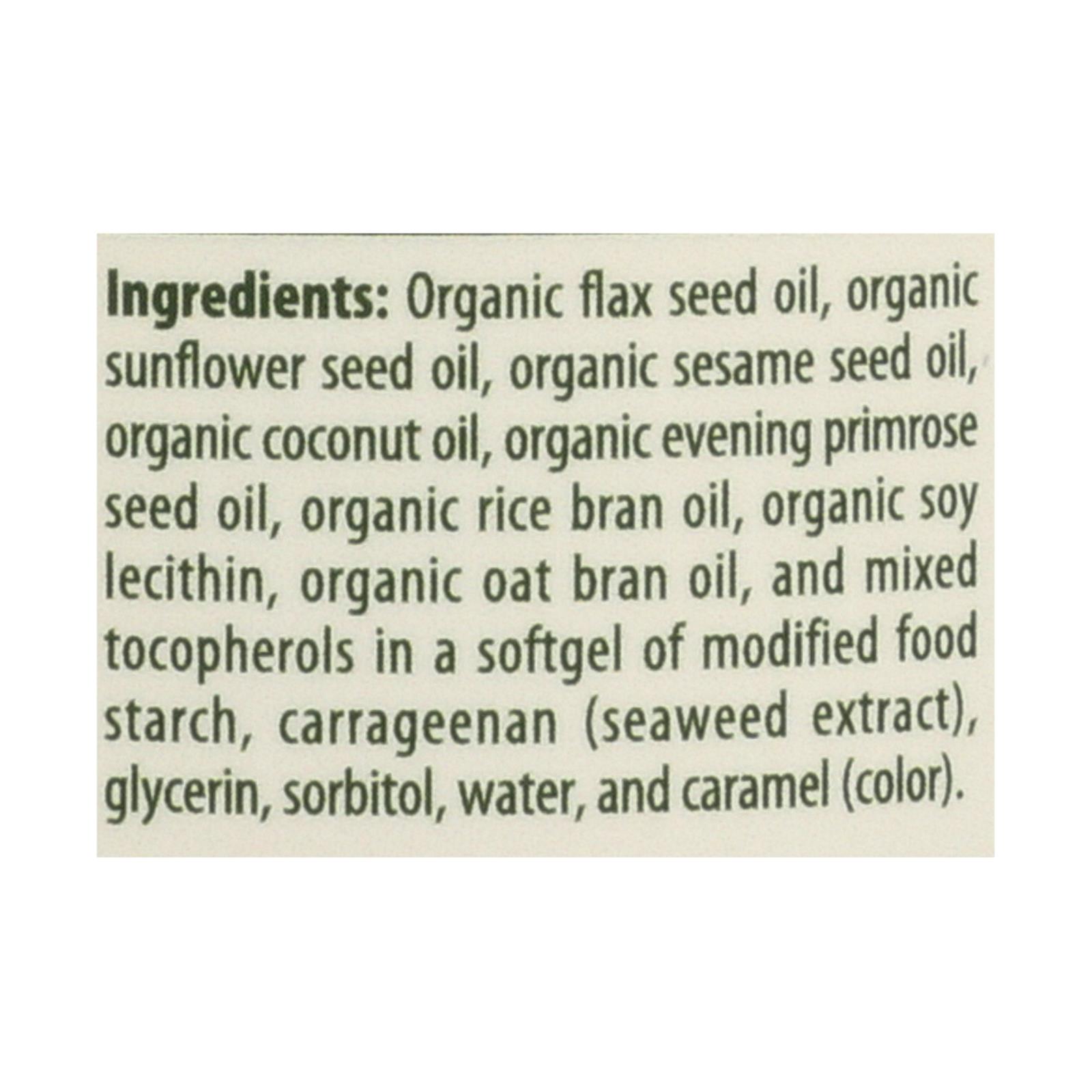 ingredients : organic flax seed oil;organic sunflower seed oil;organic sesame seed oil;organic coconut oil;organic evening primrose seed oil;organic rice bran oil;organic soy lecithin;organic oat bran oil;and mixed tocopherols in a softgel of modified food starch;carrageenan;seaweed extract;glycerin;sorbitol;water;and caramel;color