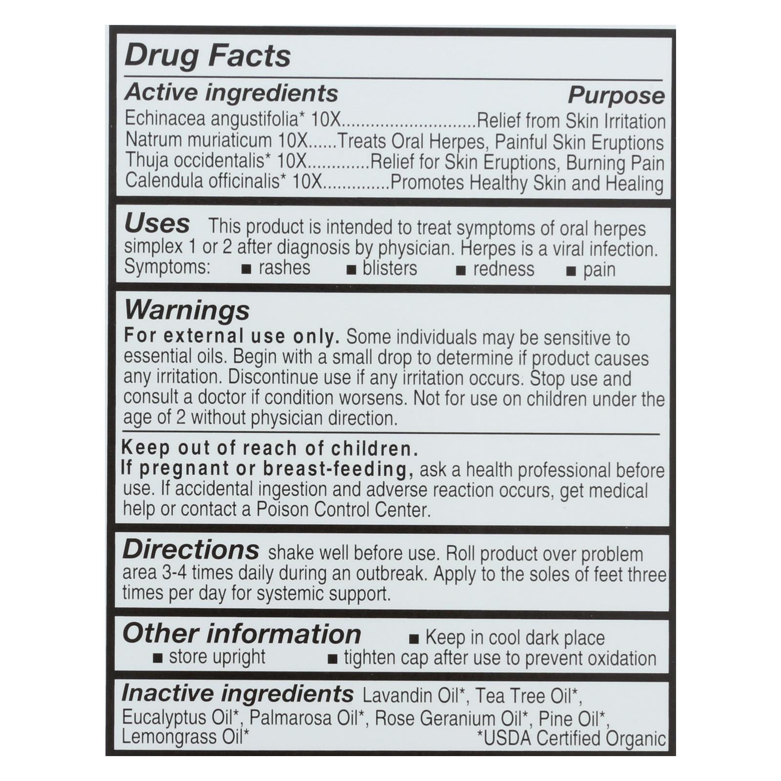 ingredients : echinacea angustifolia* 10x purpose relief from skin irritation natrum muriaticum 10x purpose treats oral herpes;painful skin eruptions thuja occidentalis* 10x purpose relief for skin eruptions;burning pain calendula officinalis* 10x purpose promotes healthy skin and healing;lavandin oil;tea tree oil;eucalyptus oil;palmarosa oil;rose geranium oil;pine oil;lemongrass oil