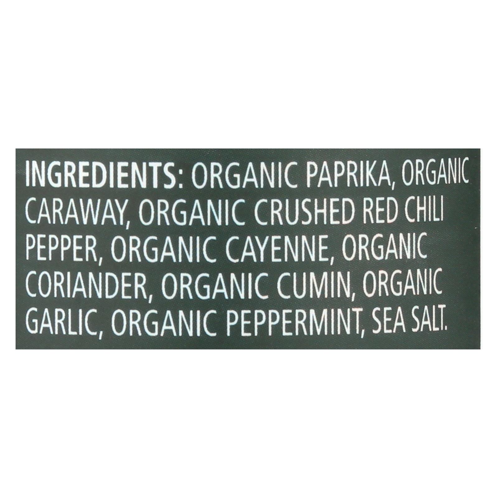 ingredients : organic paprika;organic caraway;organic crushed red chili pepper;organic cayenne;organic coriander;organic cumin;organic garlic;organic peppermint;sea salt