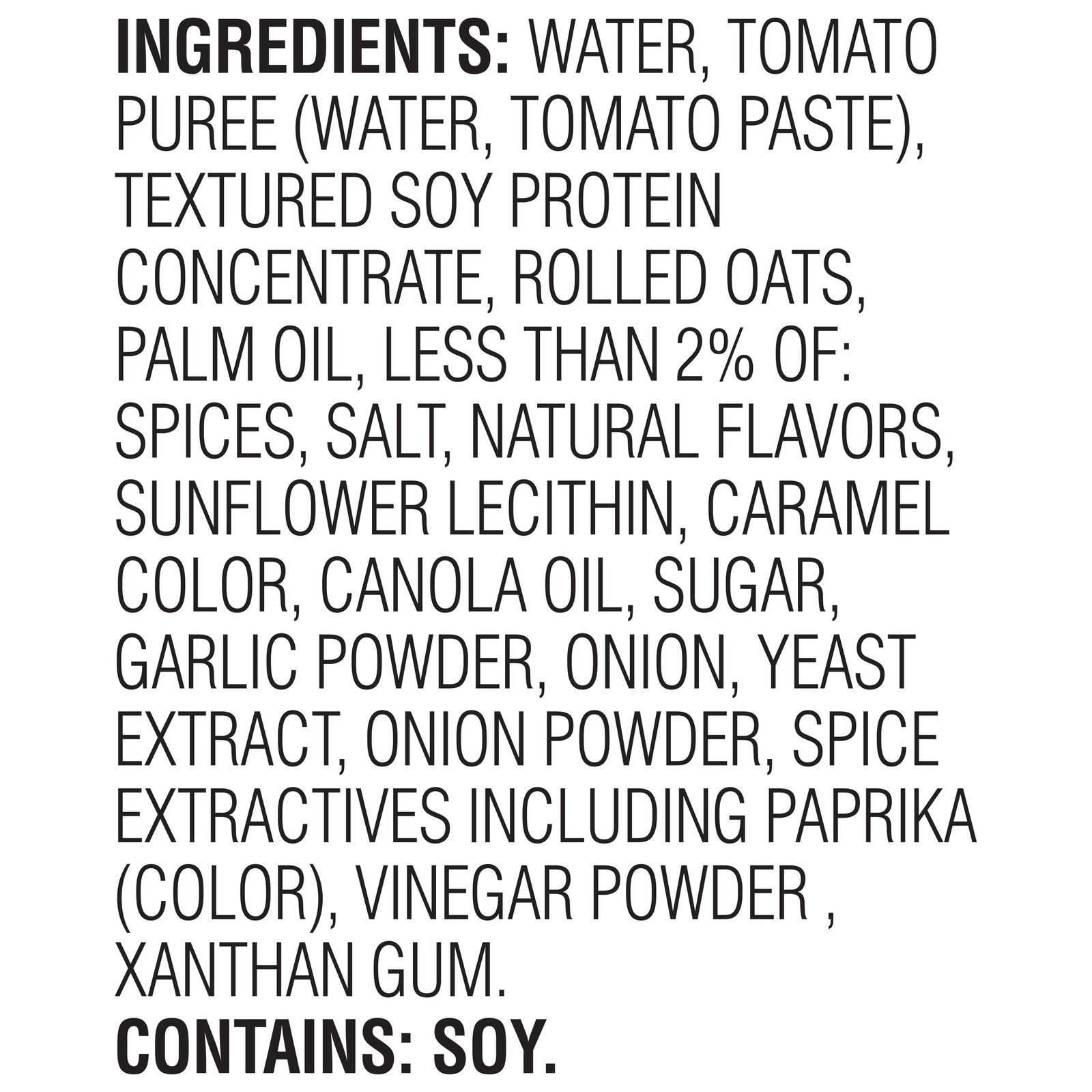 Water; tomato puree (water, tomato paste); textured soy protein concentrate; rolled oats; palm oil; less than 2% of: spices, salt, natural flavors, sunflower lecithin, caramel color, canola oil, sugar, garlic powder, onion, yeast extract, onion powder, spice extractives including paprika (color), vinegar powder, xanthan gum.