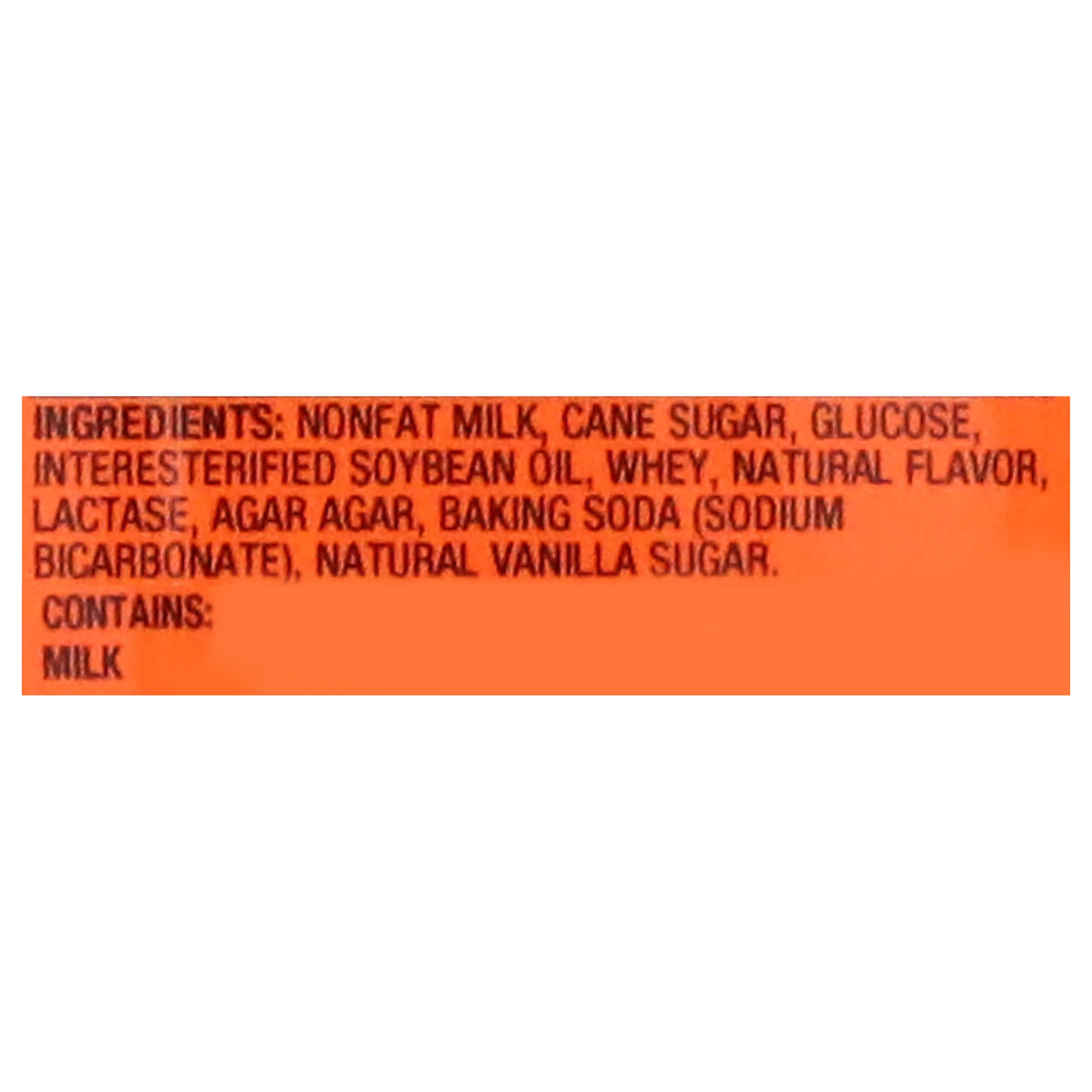Milk, cane sugar, soybean oil, glucose, natural vanilla sugar, sodium bicarbonate, natural flavors.