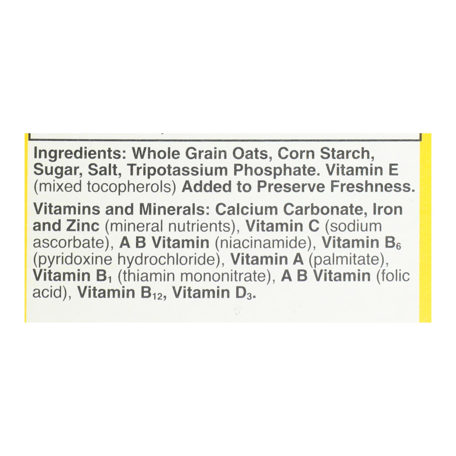 Calcium carbonate, iron and zinc (mineral nutrients), vitamin C (sodium ascorbate), a B vitamin (niacinamide), vitamin B6 (pyridoxine hydrochloride), vitamin A (palmitate), vitamin B1 (thiamin mononitrate), a B vitamin (folic acid), vitamin B12, vitamin D3, whole grain oats, corn starch, sugar, salt, tripotassium phosphate, vitamin E (mixed tocopherols) added to preserve freshness.