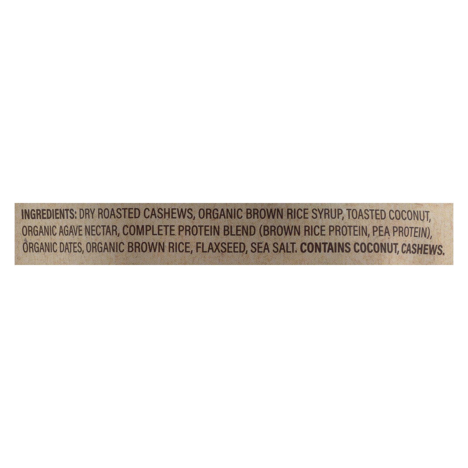 Dry roasted cashews, organic brown rice syrup, toasted coconut, organic agave nectar, complete protein blend, organic brown rice protein, pea protein, organic dates, organic medium brown rice, flaxseed, sea salt.