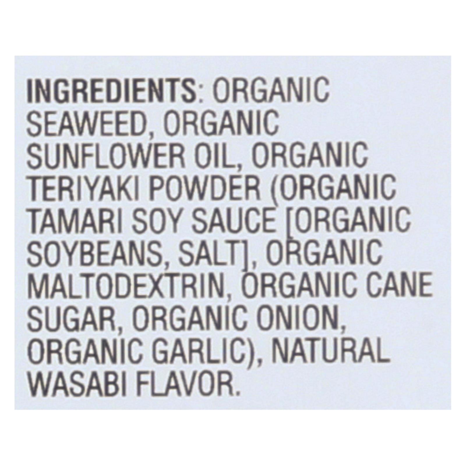 Organic seaweed, organic sunflower oil, organic teriyaki powder (organic tamari soy sauce [organic soybeans, salt], organic maltodextrin, organic cane sugar, organic onion, organic garlic), natural wasabi flavor, sea salt.