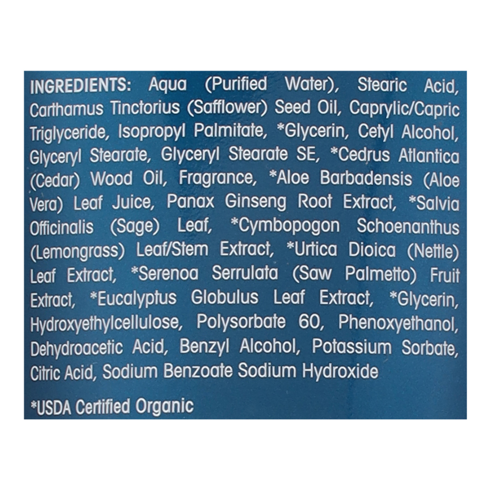 Aqua (purified water), stearic acid, carthamus tinctorius (safflower) seed oil, caprylic/capric triglyceride, isopropyl palmitate, glycerin, cetyl alcohol, glyceryl stearate, glyceryl stearate SE, cedrus atlantica (cedar) wood oil, fragrance, aloe barbadensis (aloe vera) leaf juice, panax ginseng root extract, salvia officinalis (sage) leaf, cymbopogon schoenanthus (lemongrass) leaf/stem extract, urtica dioica (nettle) leaf extract, serenoa serrulata (saw palmetto) fruit extract, eucalyptus globulus leaf extract.