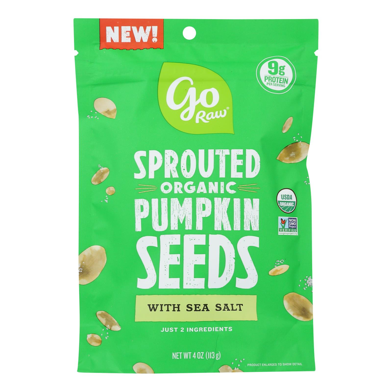 Go Raw Snack Seed Pumpkin Sprtd is a 95%+ organic, vegan, gluten-free, and non-GMO snack with sprouted pumpkin seeds and sea salt, sold in a case of 10