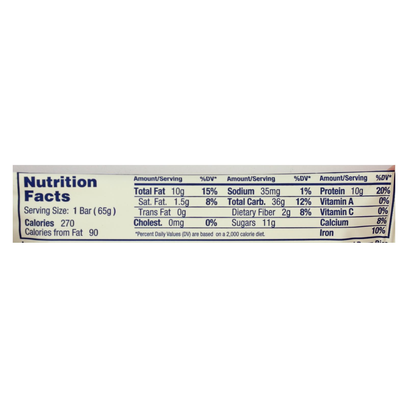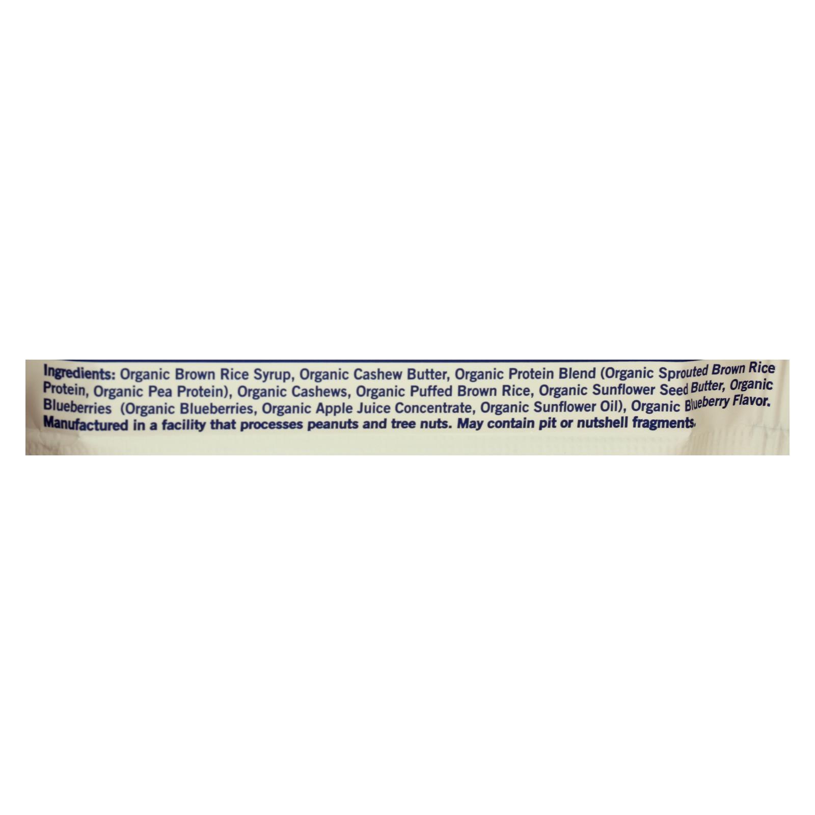 ingredients : organic brown rice syrup;organic cashew butter;organic protein blend;organic sprouted brown rice protein;organic pea protein;organic cashews;organic puffed brown rice;organic sunflower seed butter;organic blueberries;organic apple juice concentrate;organic sunflower oil;organic blueberry flavor